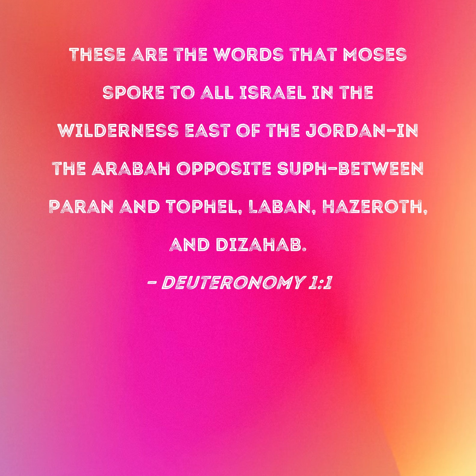 Deuteronomy 1:1 These are the words that Moses spoke to all Israel in the wilderness east of the Jordan--in the Arabah opposite Suph--between Paran and Tophel, Laban, Hazeroth, and Dizahab.