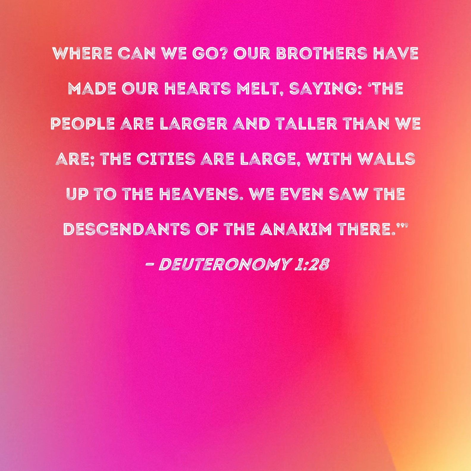 Deuteronomy 1:28 NIVDeuteronomy 1:28 NLTDeuteronomy 1:28 ESVDeuteronomy 1:28 NASBDeuteronomy 1:28 KJVDeuteronomy 1:28 InterlinearDeuteronomy 1:28 CommentariesDeuteronomy 1:28 Parallel TextsDeuteronomy 1:28 Bible AppsDeuteronomy 1:28 ParallelBible Hub