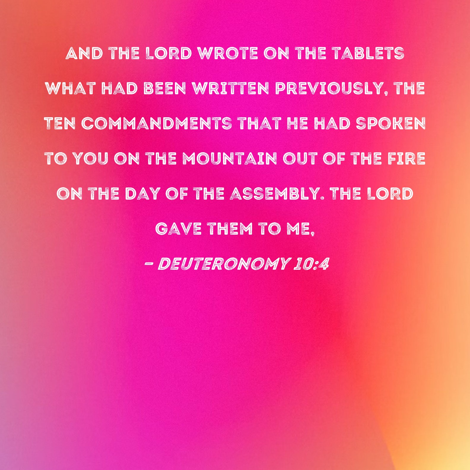 Deuteronomy 10:4 And the LORD wrote on the tablets what had been written previously, the Ten Commandments that He had spoken to you on the mountain out of the fire on the day of the assembly. The LORD gave them to me,