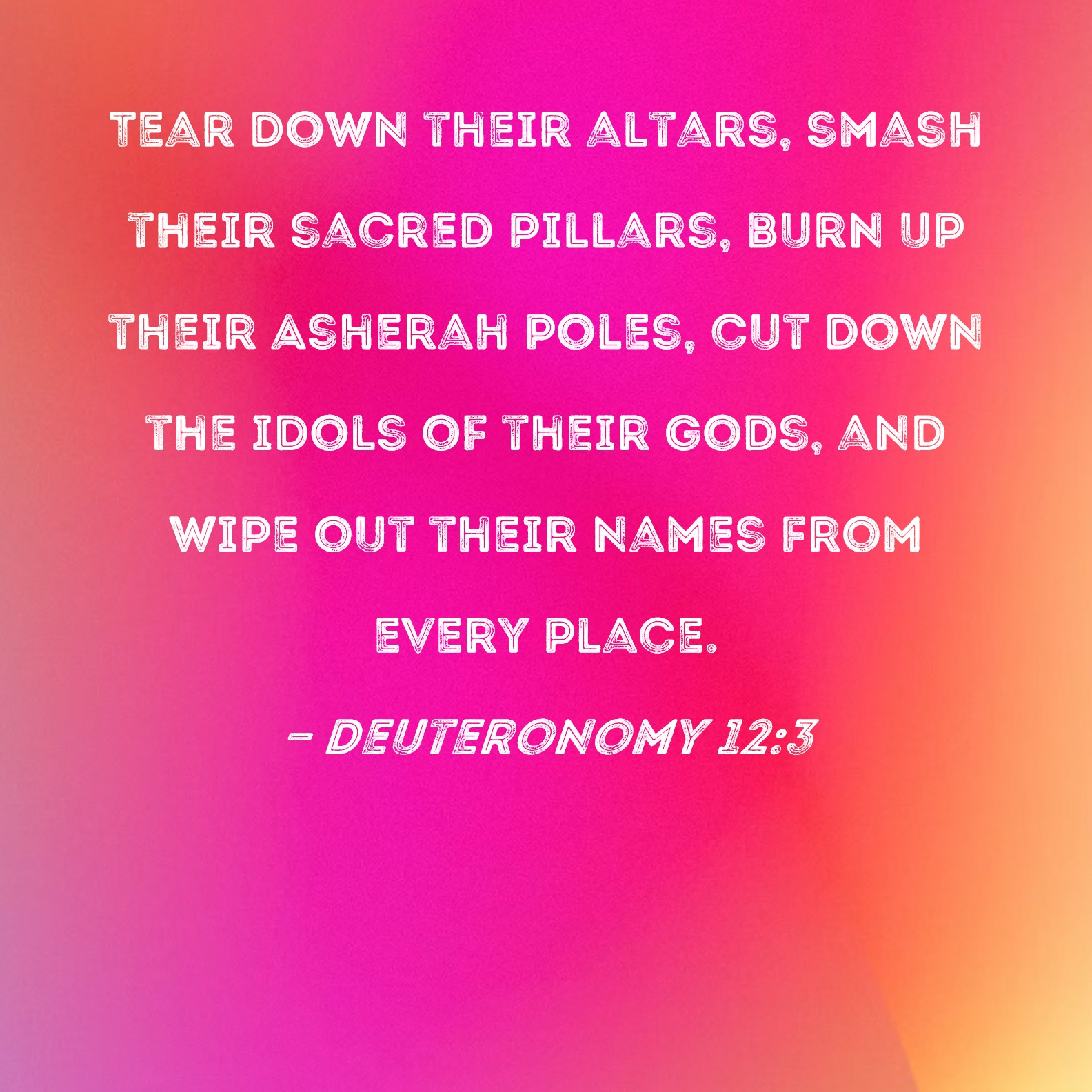 Deuteronomy 12:3 Tear down their altars, smash their sacred pillars, burn up their Asherah poles, cut down the idols of their gods, and wipe out their names from every place.