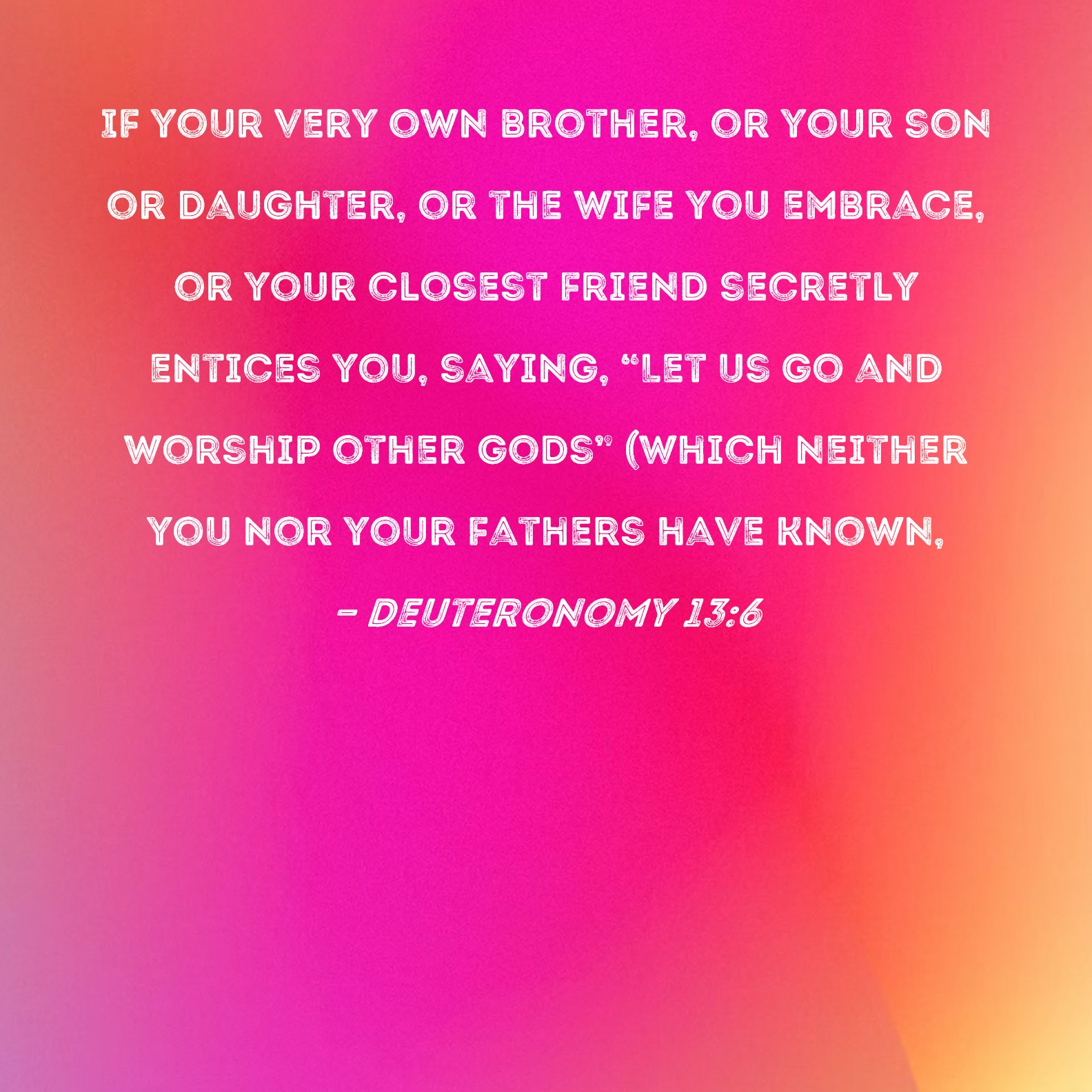 Deuteronomy 13:6 If your very own brother, or your son or daughter, or the wife you embrace, or your closest friend secretly entices you, saying, "Let us go and worship other gods" (which neither you nor your fathers have known,