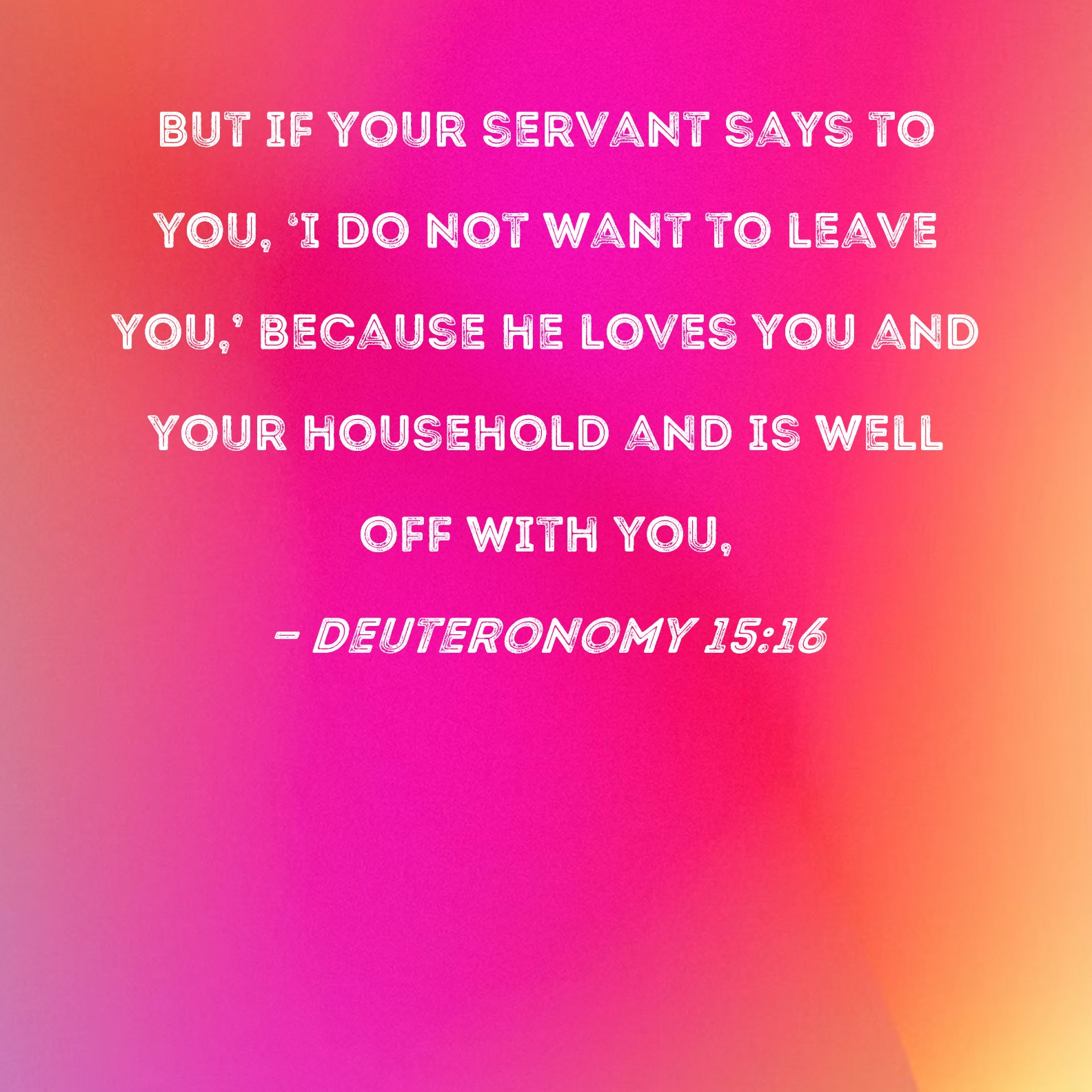Deuteronomy 15:16 But if your servant says to you, 'I do not want to leave you,' because he loves you and your household and is well off with you,