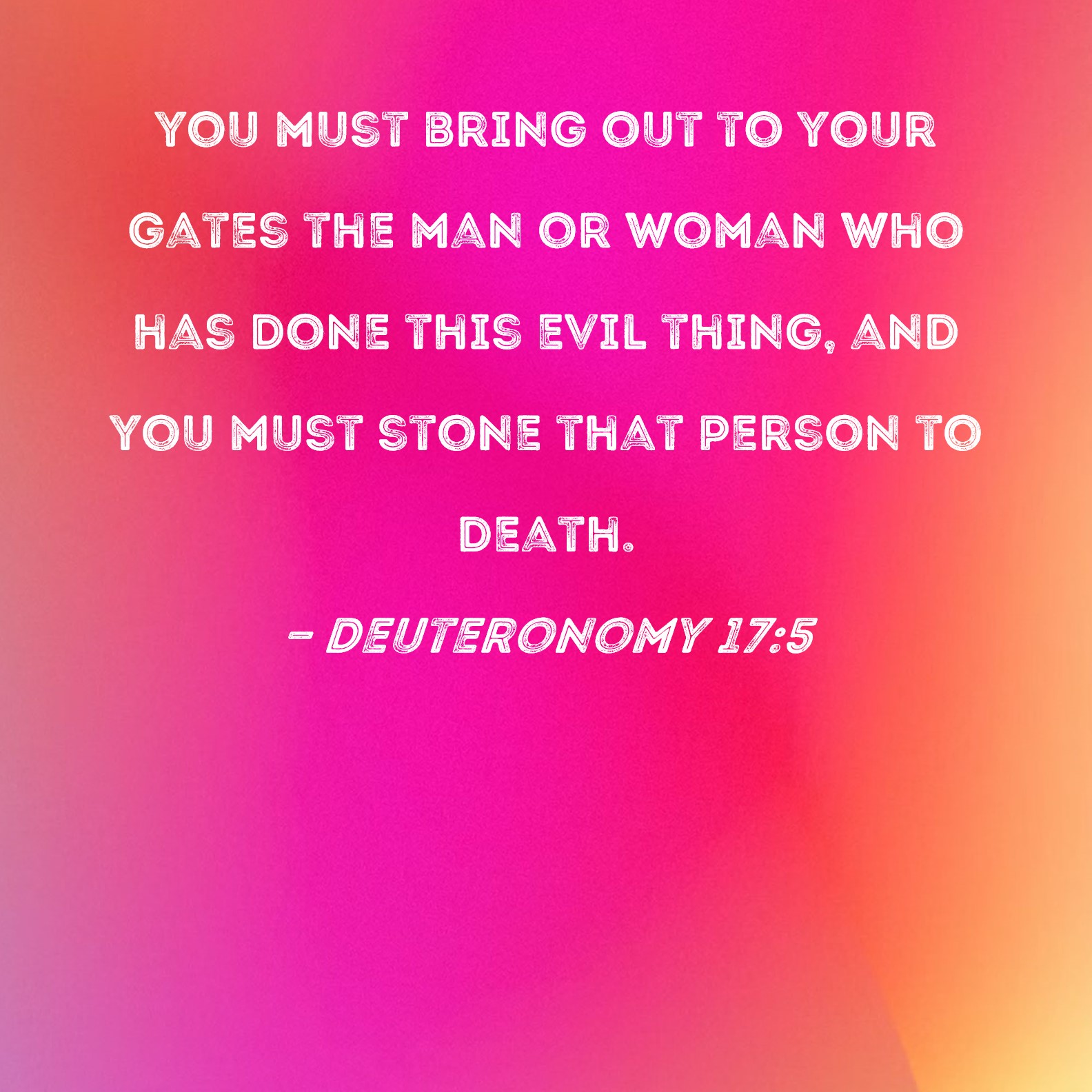 Deuteronomy 17:5 you must bring out to your gates the man or woman who has done this evil thing, and you must stone that person to death.