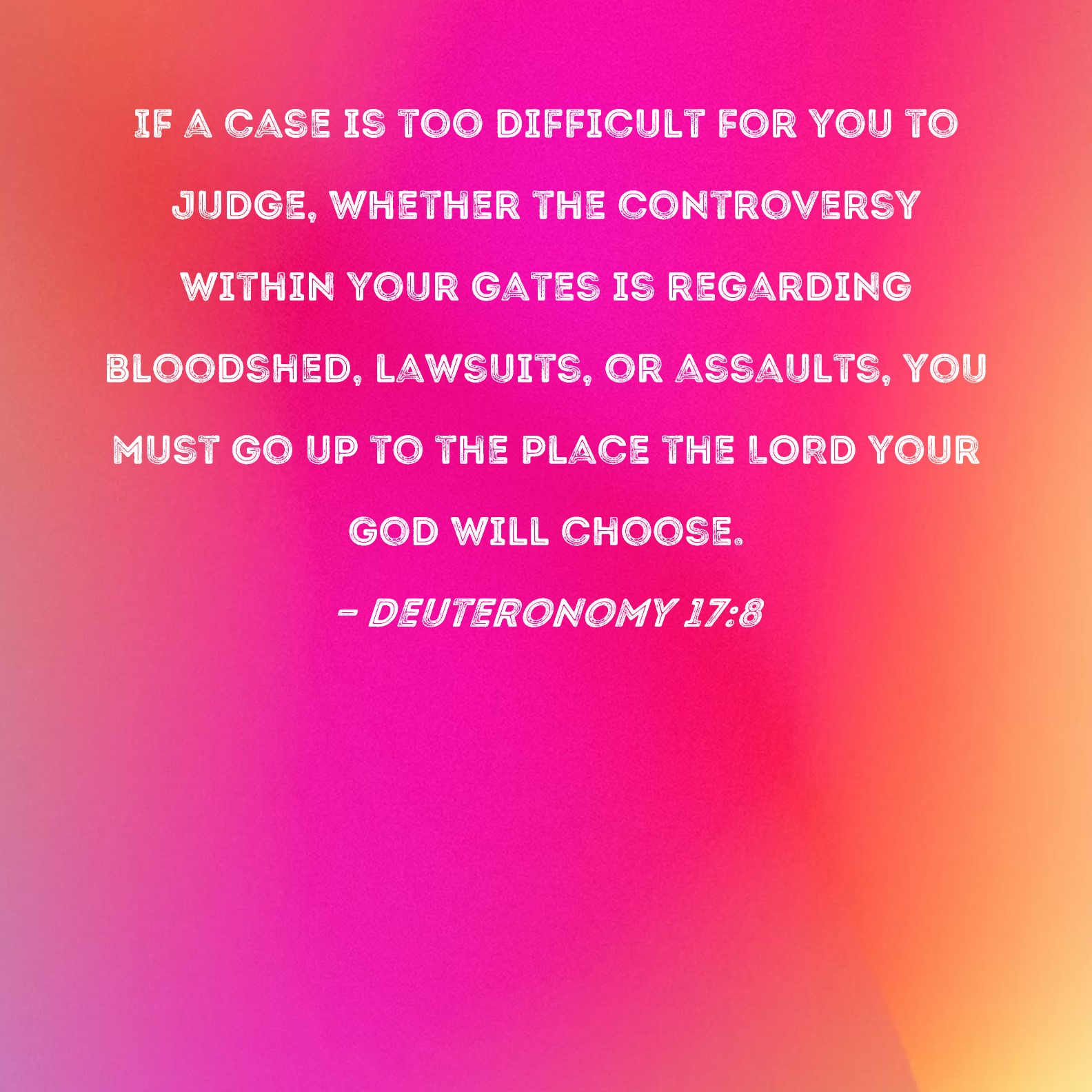Deuteronomy 17:8 If a case is too difficult for you to judge, whether the controversy within your gates is regarding bloodshed, lawsuits, or assaults, you must go up to the place the LORD your God will choose.
