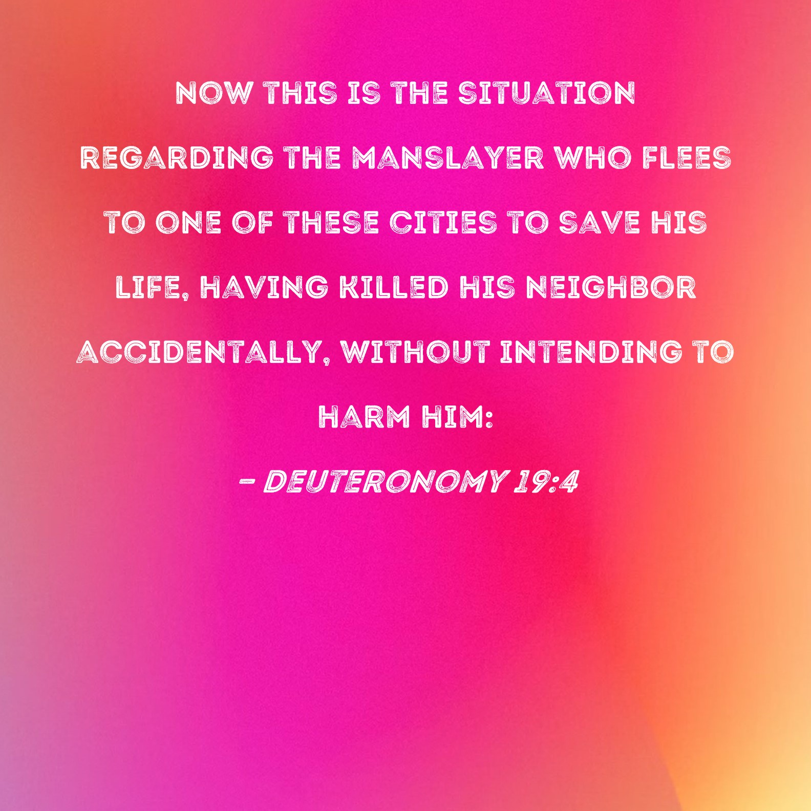 Deuteronomy 19:4 Now this is the situation regarding the manslayer who flees to one of these cities to save his life, having killed his neighbor accidentally, without intending to harm him: