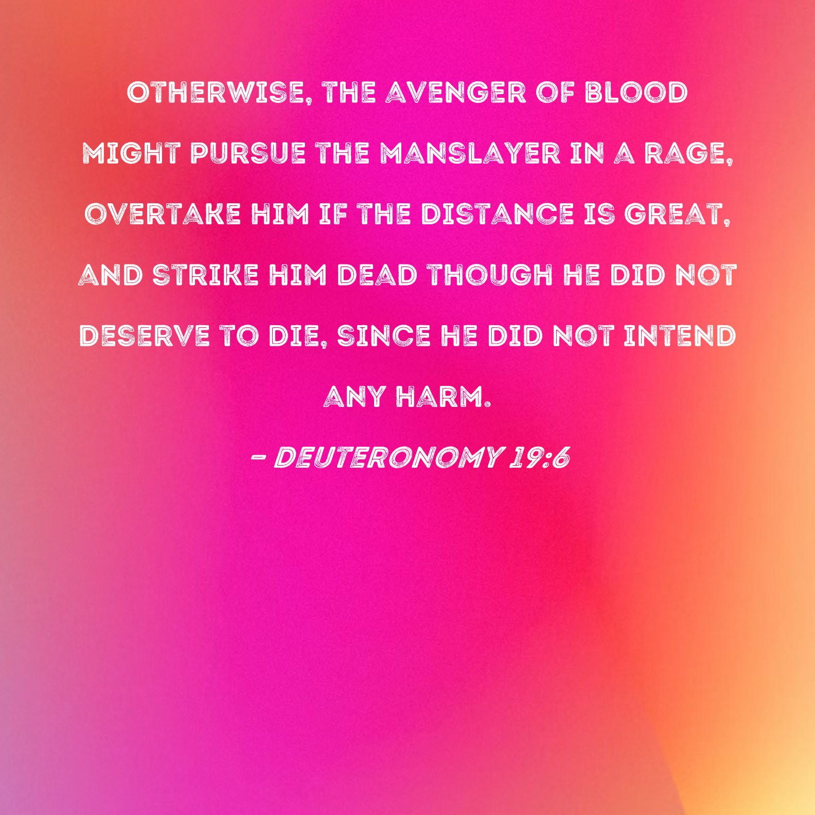 Deuteronomy 19:6 Otherwise, the avenger of blood might pursue the manslayer in a rage, overtake him if the distance is great, and strike him dead though he did not deserve to die, since he did not intend any harm.