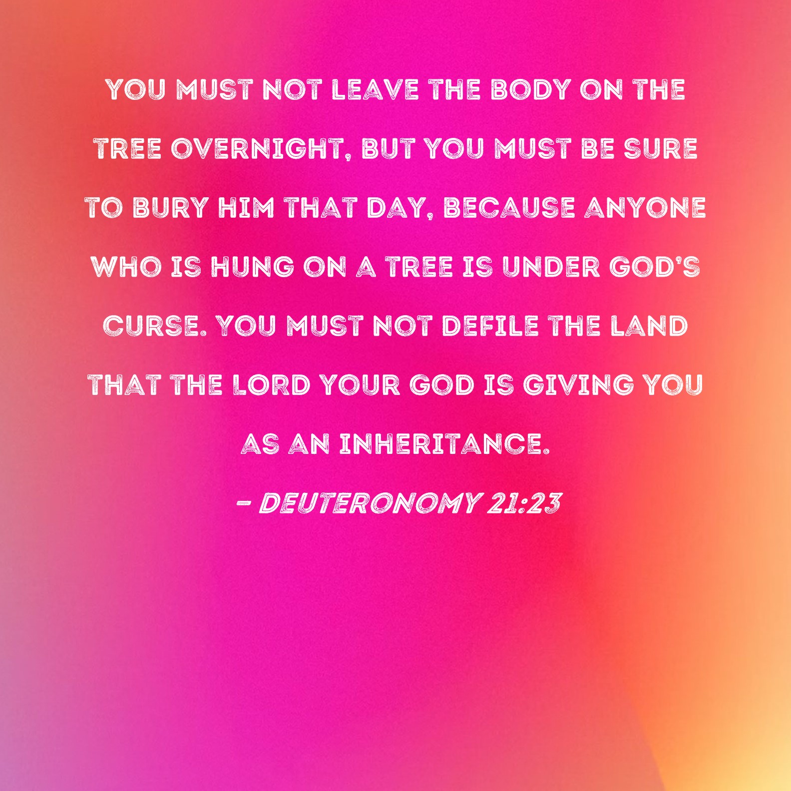 Deuteronomy 21:23 you must not leave the body on the tree overnight, but you must be sure to bury him that day, because anyone who is hung on a tree is under God's curse. You must not defile the land that the LORD your God is giving you as an inheritance.