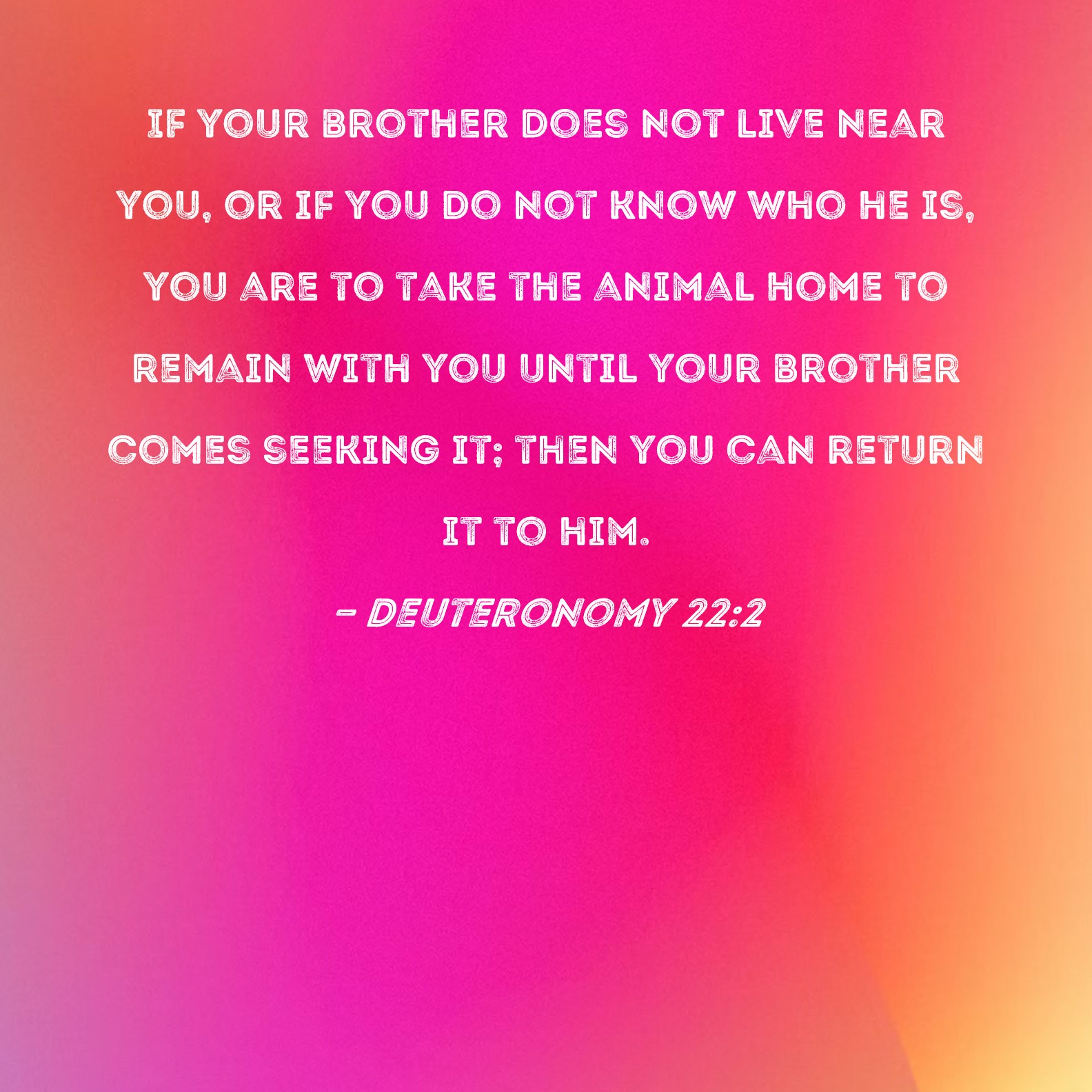 Deuteronomy 22:2 If your brother does not live near you, or if you do not know who he is, you are to take the animal home to remain with you until your brother comes seeking it; then you can return it to him.