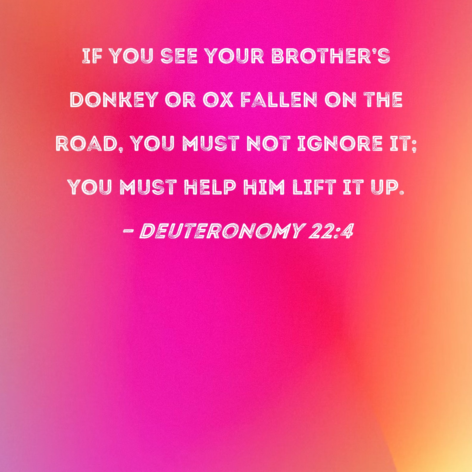 Deuteronomy 22:4 If you see your brother's donkey or ox fallen on the road, you must not ignore it; you must help him lift it up.