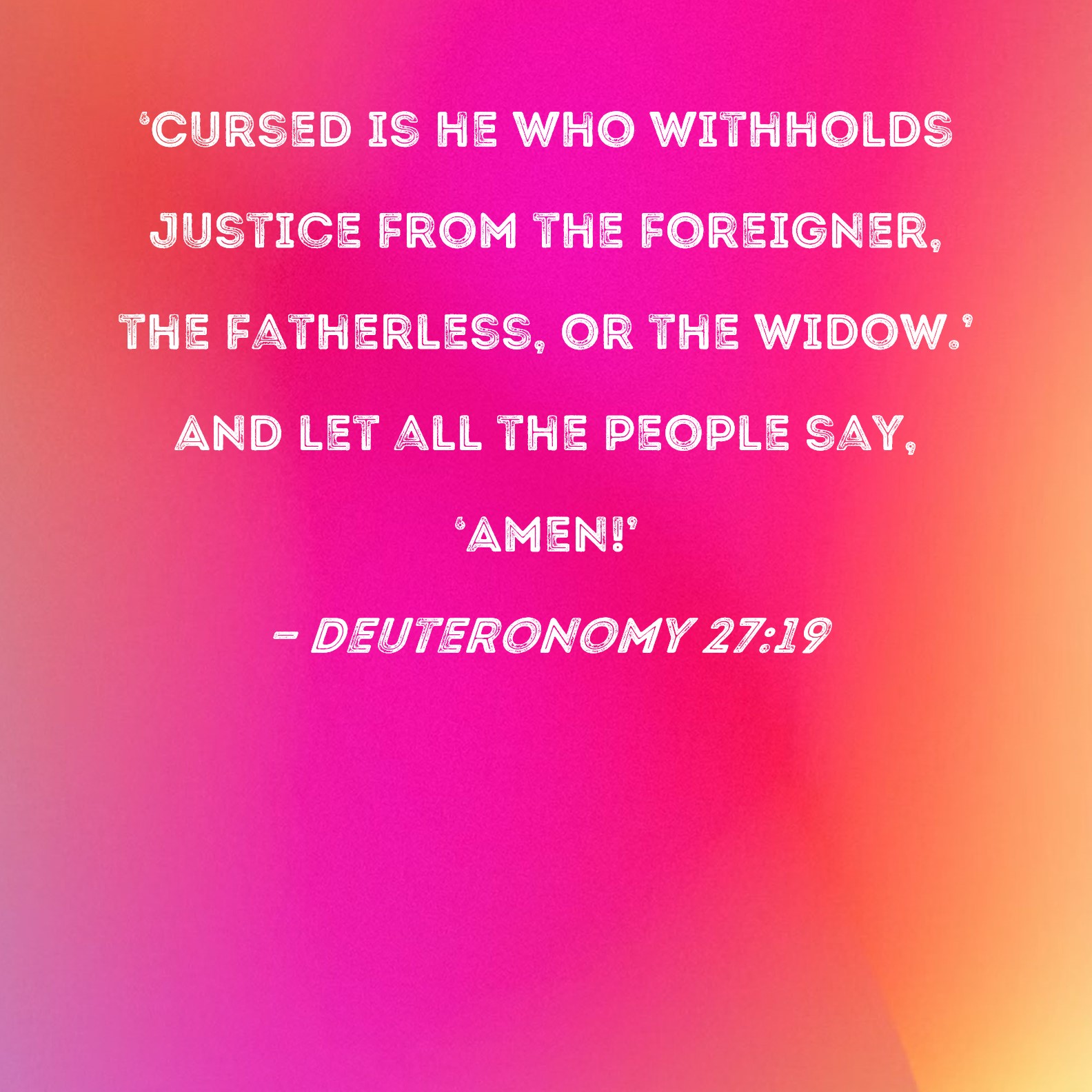 Deuteronomy 27:19 Cursed is he who withholds justice from the foreigner, the fatherless, or the widow.' And let all the people say, 'Amen!'