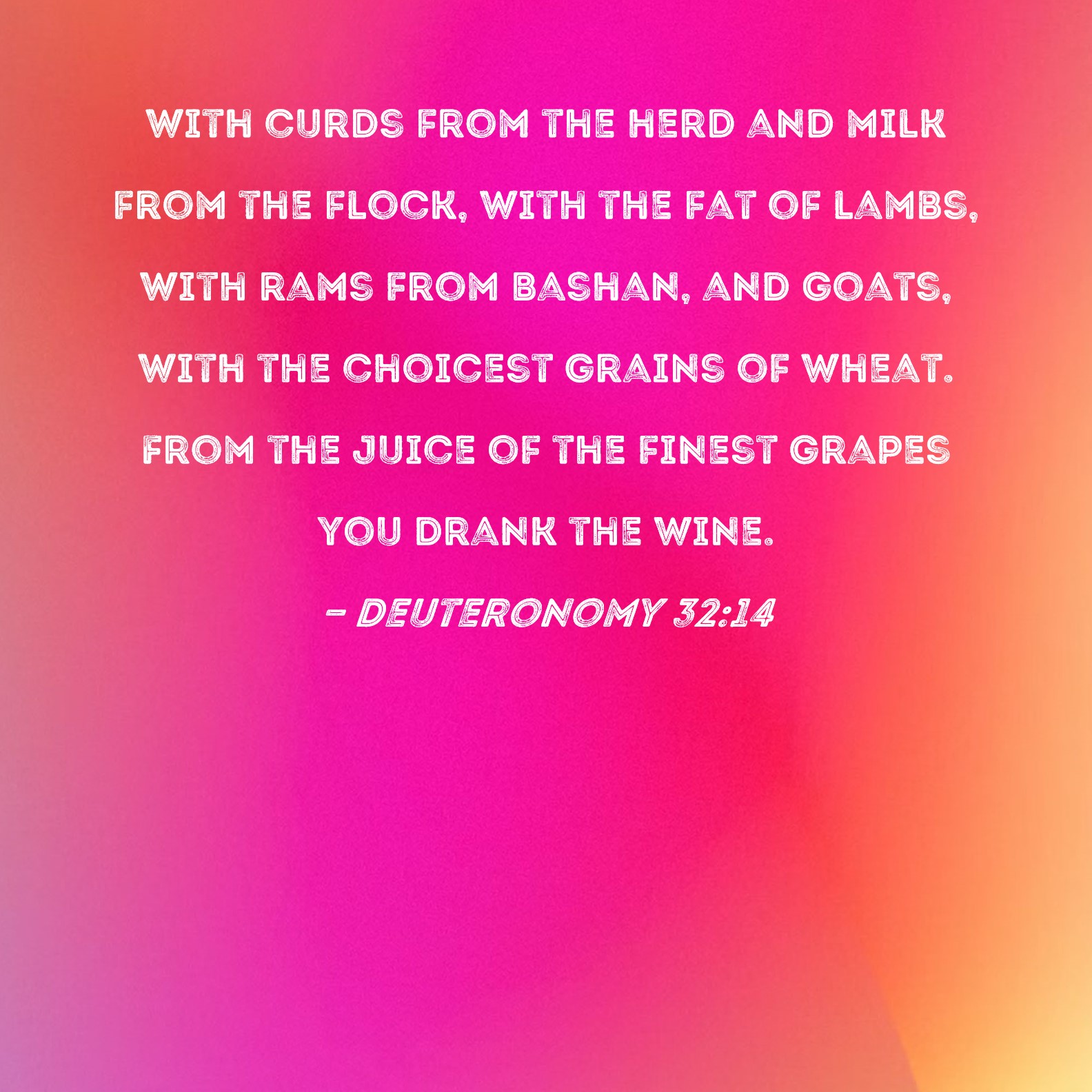 Deuteronomy 32:14 with curds from the herd and milk from the flock, with the fat of lambs, with rams from Bashan, and goats, with the choicest grains of wheat. From the juice of the finest grapes you drank the wine.