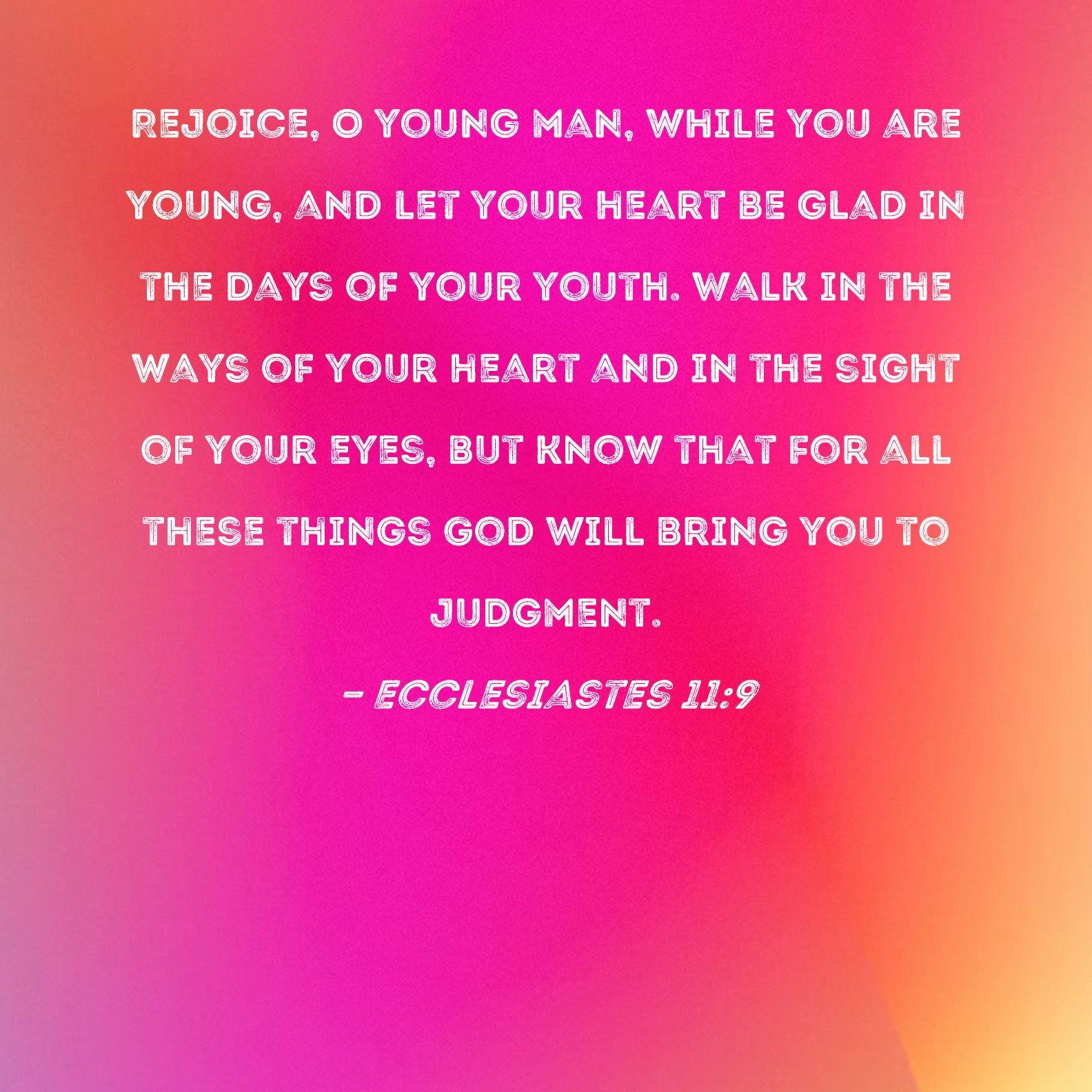 Ecclesiastes 11:9 Rejoice, O young man, while you are young, and let your heart be glad in the days of your youth. Walk in the ways of your heart and in the sight of your eyes, but know that for all these things God will bring you to judgment.