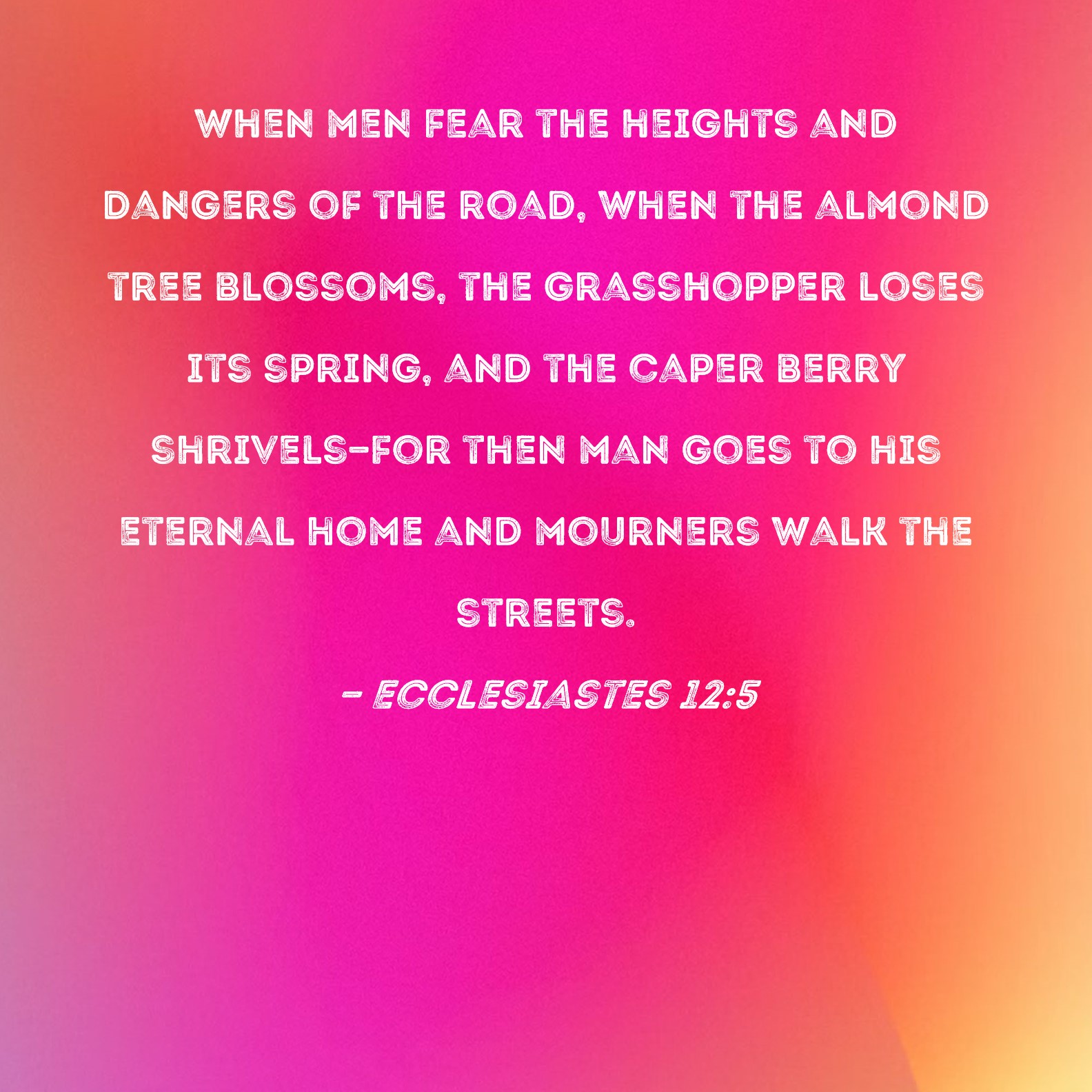 Ecclesiastes 12:5 when men fear the heights and dangers of the road, when the almond tree blossoms, the grasshopper loses its spring, and the caper berry shrivels--for then man goes to his eternal home and mourners walk the streets.