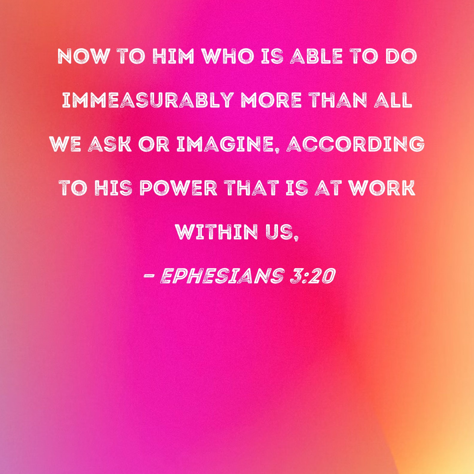 BSB: Now to Him who is able to do immeasurably more than all we ask or imagine, according to His power that is at work within us, KJV: Now unto him that is able to do exceeding abundantly above all that we ask or think, according to the power that worketh in us, DRB: Now to him who is able to do all things more abundantly than we desire or understand, according to the power that worketh in us; DBT: But to him that is able to do far exceedingly above all which we ask or think, according to the power which works in us, ERV: Now unto him that is able to do exceeding abundantly above all that we ask or think, according to the power that worketh in us, WBT: Now to him that is able to do exceeding abundantly above all that we ask or think, according to the power that worketh in us. WEB: Now to him who is able to do exceedingly abundantly above all that we ask or think, according to the power that works in us, YLT: and to Him who is able above all things to do exceeding abundantly what we ask or think, according to the power that is working in us,Links Ephesians 3:20 NIV • Ephesians 3:20 NLT • Ephesians 3:20 ESV • Ephesians 3:20 NASB • Ephesians 3:20 KJV • Ephesians 3:20 Interlinear • Ephesians 3:20 Commentaries • Ephesians 3:20 Parallel Texts • Ephesians 3:20 Bible Apps • Ephesians 3:20 Parallel • Bible Hub |
