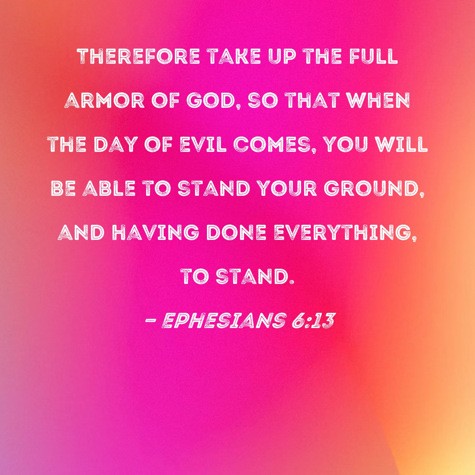 Ephesians 6:13 Therefore take up the full armor of God, so that when the day of evil comes, you will be able to stand your ground, and having done everything, to stand.