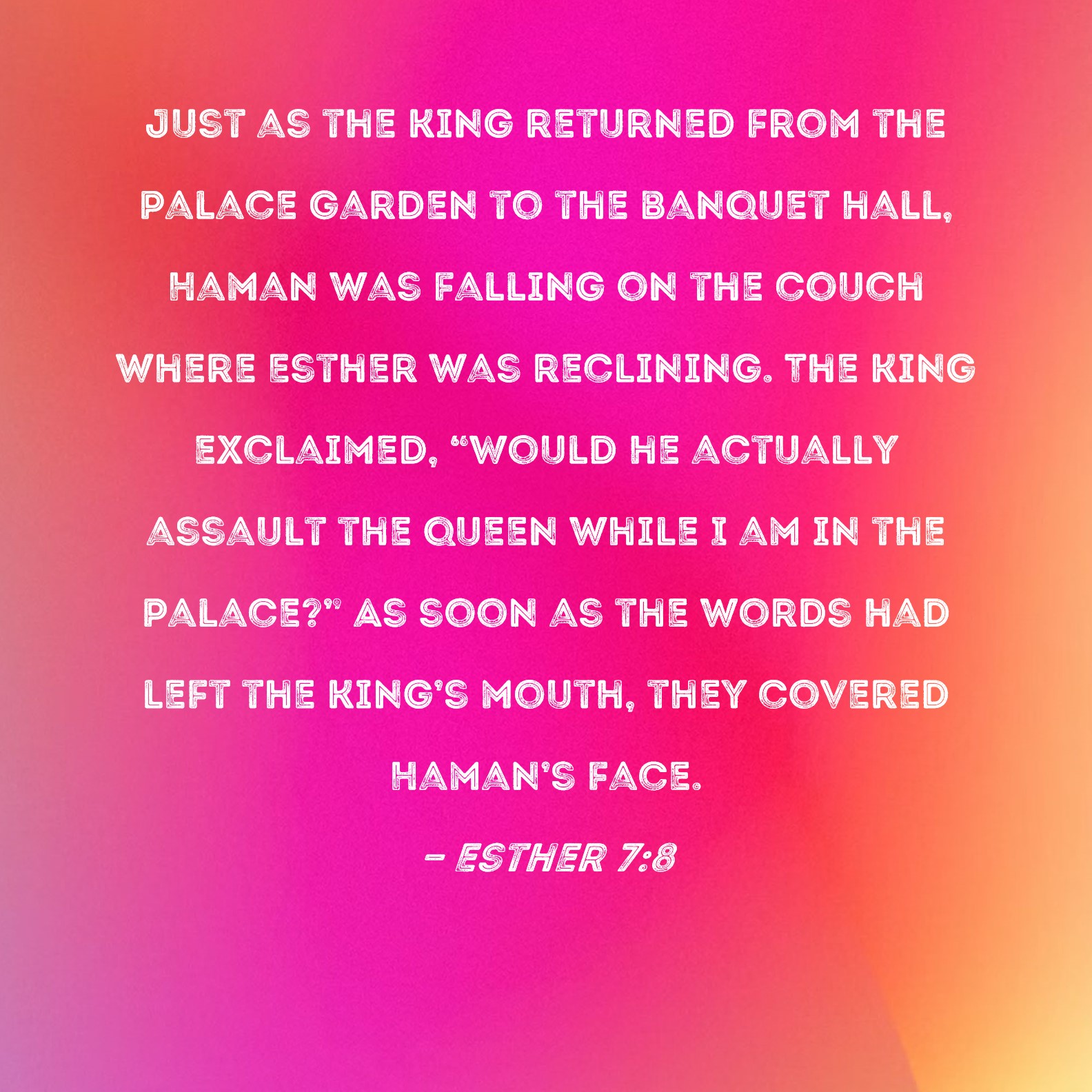 Esther 7:8 Just as the king returned from the palace garden to the banquet hall, Haman was falling on the couch where Esther was reclining. The king exclaimed, "Would he actually assault the queen while I am in the palace?" As soon as the words had left the king's mouth, they covered Haman's face.