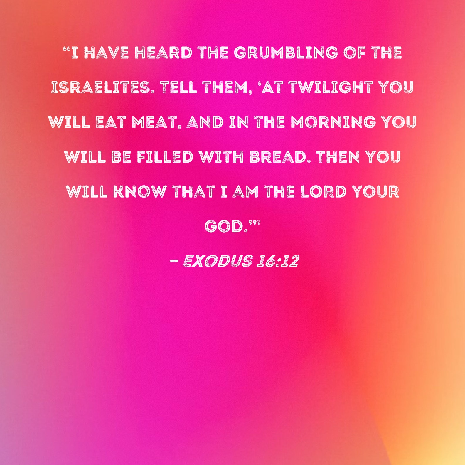 Exodus 16:12 "I have heard the grumbling of the Israelites. Tell them, 'At twilight you will eat meat, and in the morning you will be filled with bread. Then you will know that I am the LORD your God.'"