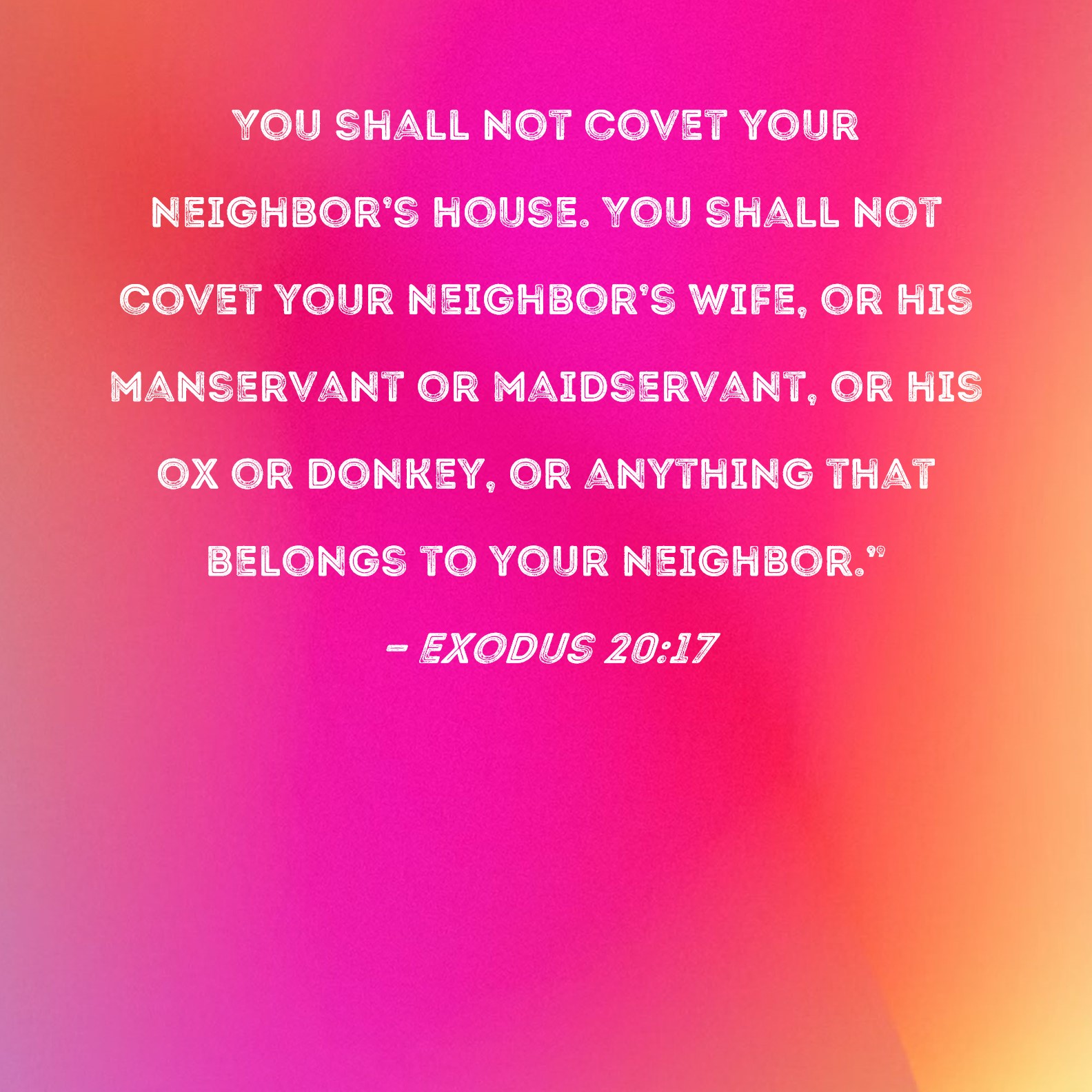 Exodus 20:17 You shall not covet your neighbor's house. You shall not covet your neighbor's wife, or his manservant or maidservant, or his ox or donkey, or anything that belongs to your neighbor."
