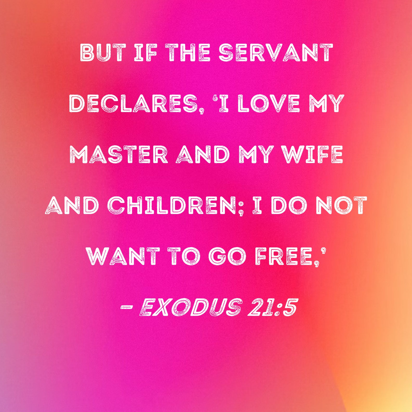 Exodus 21:5 But if the servant declares, 'I love my master and my wife and children; I do not want to go free,'