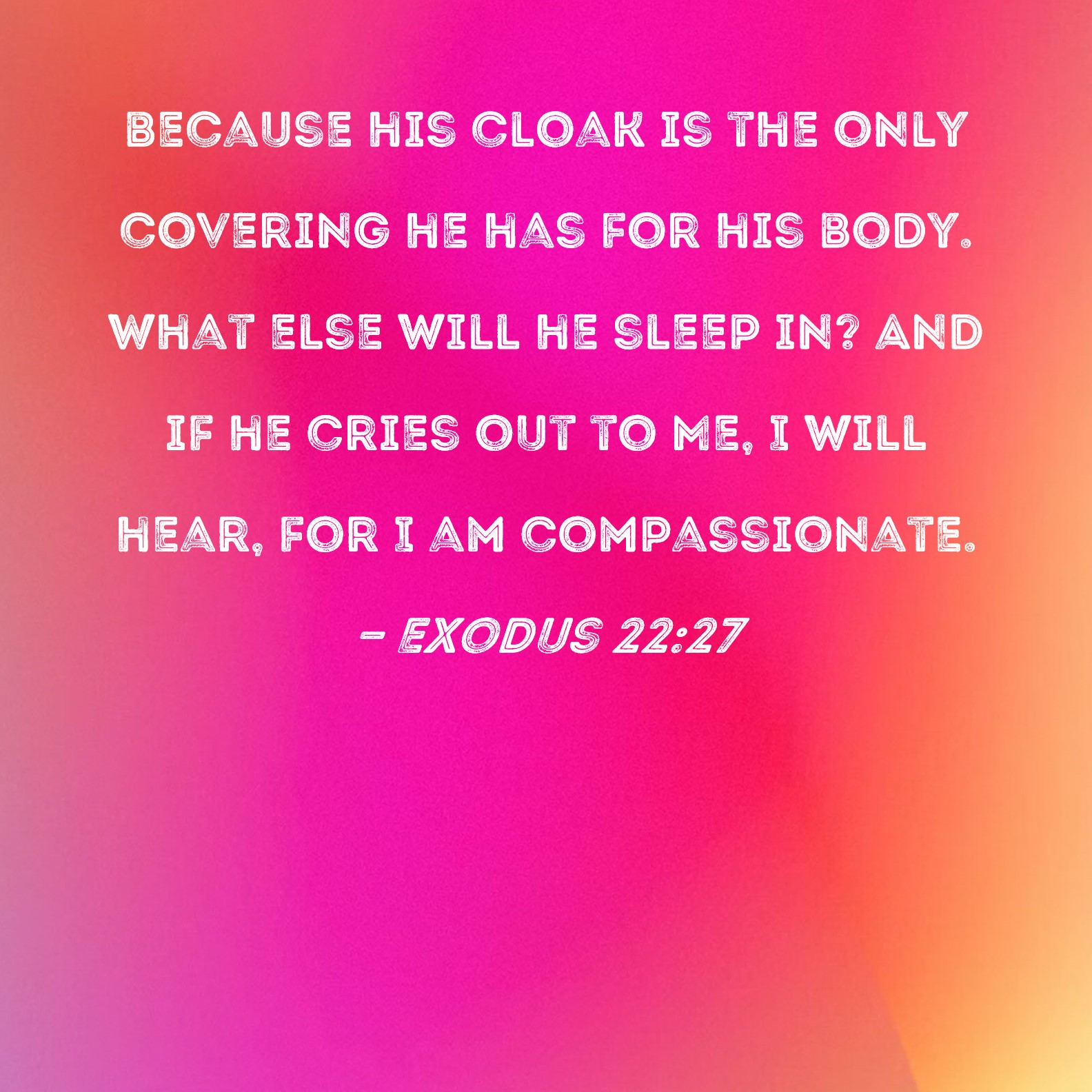 Exodus 22:27 because his cloak is the only covering he has for his body. What else will he sleep in? And if he cries out to Me, I will hear, for I am compassionate.