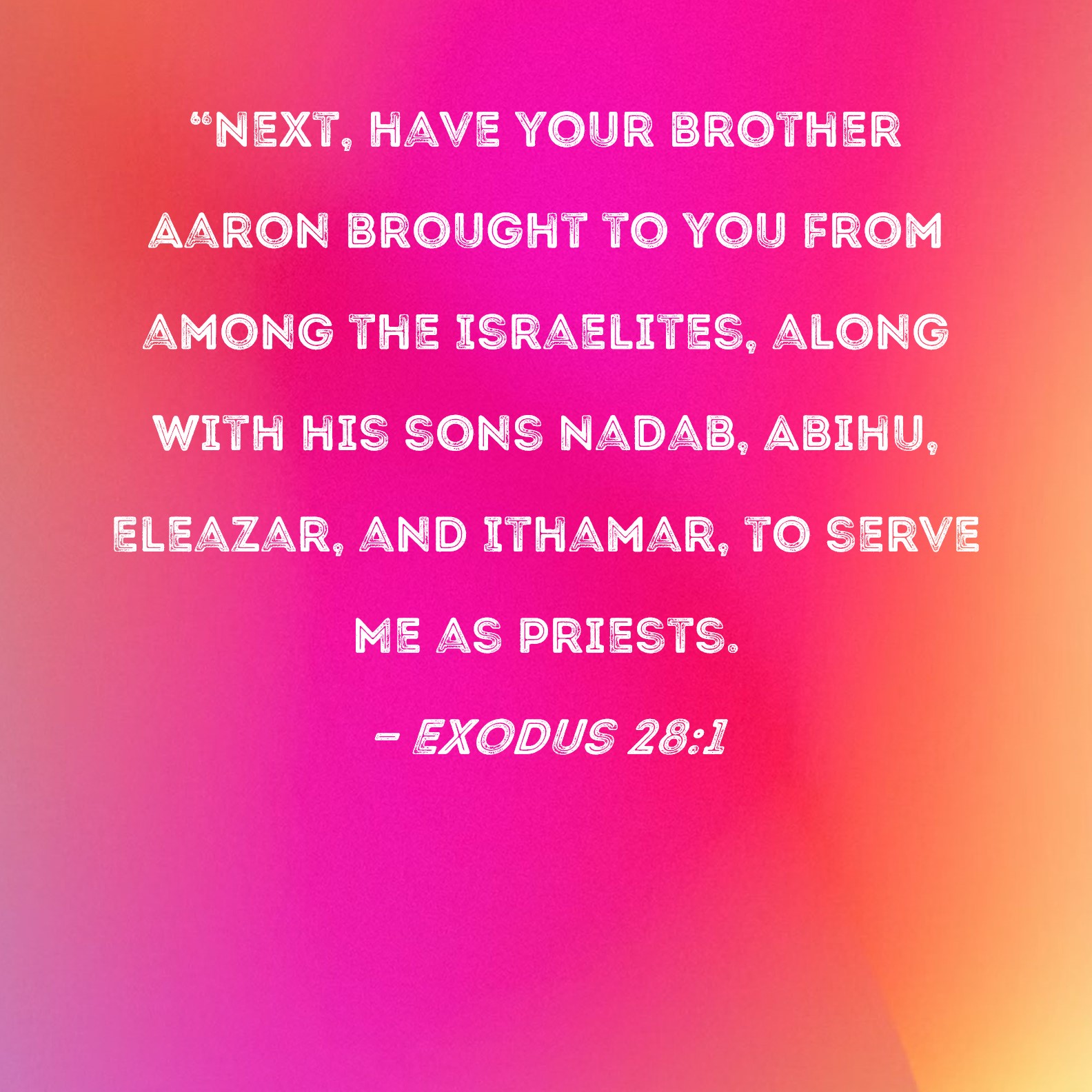 Exodus 28:1 "Next, have your brother Aaron brought to you from among the Israelites, along with his sons Nadab, Abihu, Eleazar, and Ithamar, to serve Me as priests.