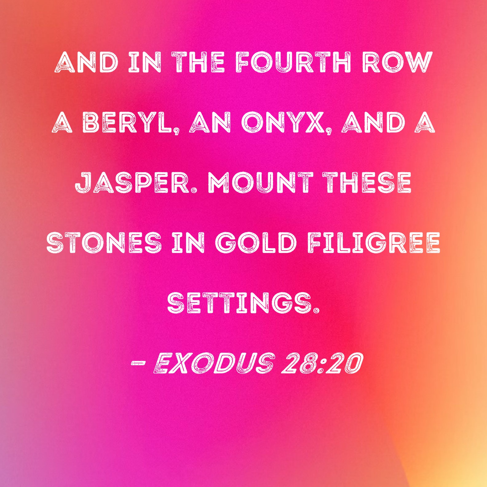 BSB: and in the fourth row a beryl, an onyx, and a jasper. Mount these stones in gold filigree settings. KJV: And the fourth row a beryl, and an onyx, and a jasper: they shall be set in gold in their inclosings. DRB: In the fourth a chrysolite, an onyx, and a beryl. They shall be set in gold by their rows. DBT: and the fourth row, a chrysolite, and an onyx, and a jasper; enclosed in gold shall they be in their settings. ERV: and the fourth row a beryl, and an onyx, and a jasper: they shall be enclosed in gold in their settings. WBT: And the fourth row a beryl, and an onyx, and a jasper: they shall be set in gold in their inclosings. WEB: and the fourth row a chrysolite, an onyx, and a jasper. They shall be enclosed in gold in their settings. YLT: and the fourth row is beryl, and onyx, and jasper; embroidered with gold are they in their settings,Links Exodus 28:20 NIV • Exodus 28:20 NLT • Exodus 28:20 ESV • Exodus 28:20 NASB • Exodus 28:20 KJV • Exodus 28:20 Interlinear • Exodus 28:20 Commentaries • Exodus 28:20 Parallel Texts • Exodus 28:20 Bible Apps • Exodus 28:20 Parallel • Bible Hub |