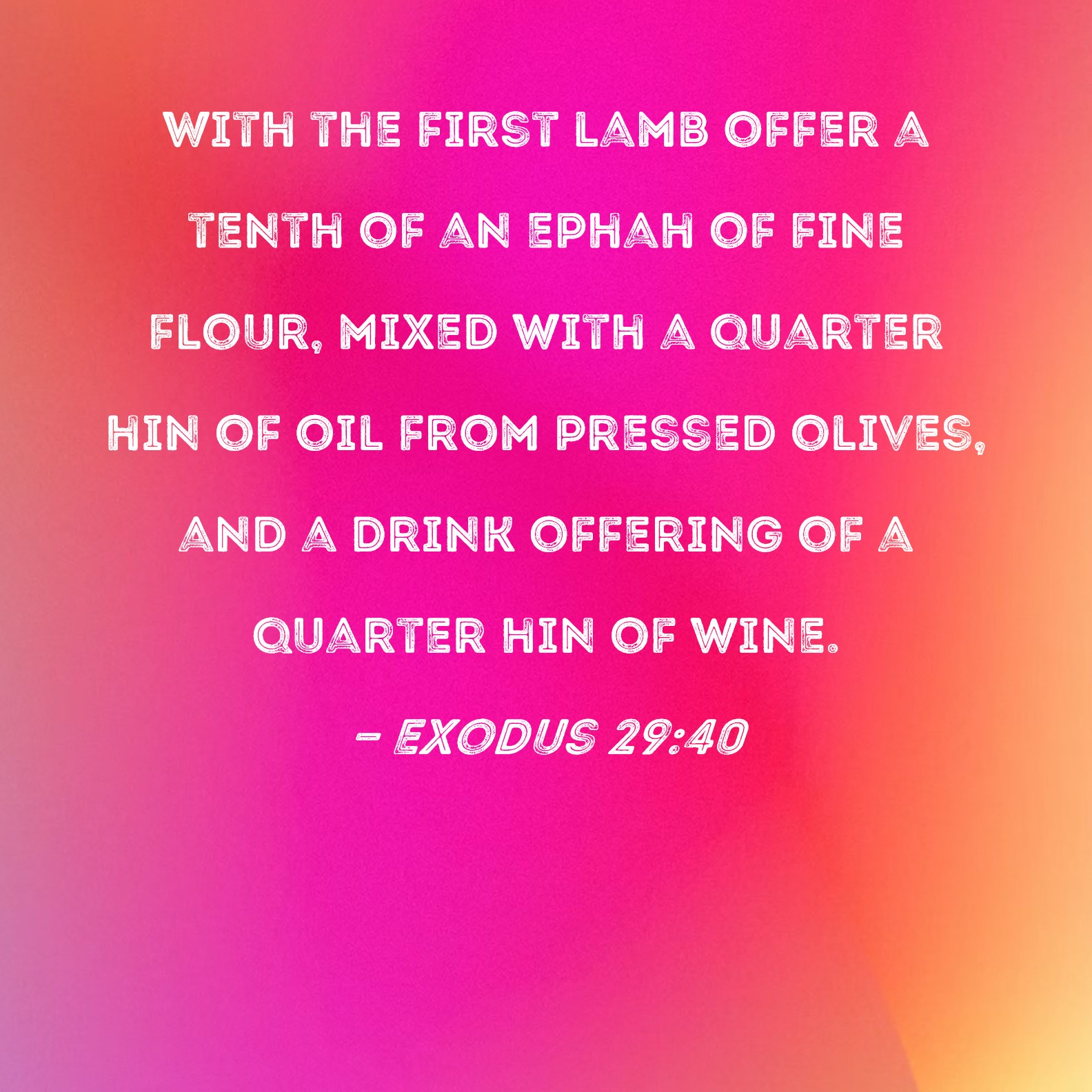 Exodus 29:40 With the first lamb offer a tenth of an ephah of fine flour, mixed with a quarter hin of oil from pressed olives, and a drink offering of a quarter hin of wine.