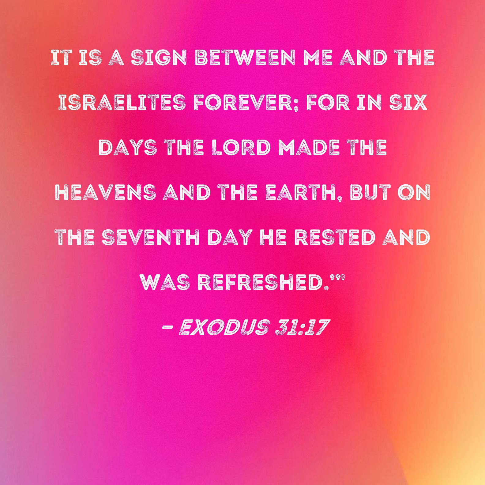 Exodus 31:17 It is a sign between Me and the Israelites forever; for in six days the LORD made the heavens and the earth, but on the seventh day He rested and was refreshed.'"