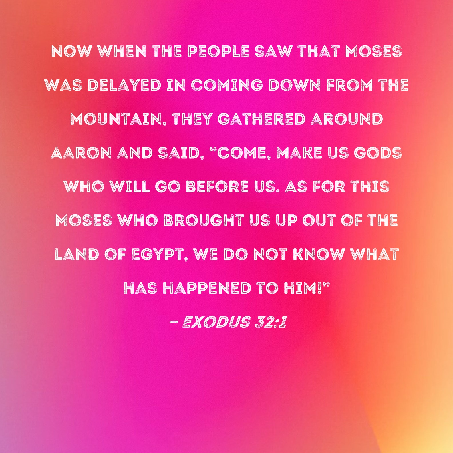 Exodus 32:1 Now when the people saw that Moses was delayed in coming down from the mountain, they gathered around Aaron and said, "Come, make us gods who will go before us. As for this Moses who brought us up out of the land of Egypt, we do not know what has happened to him!"
