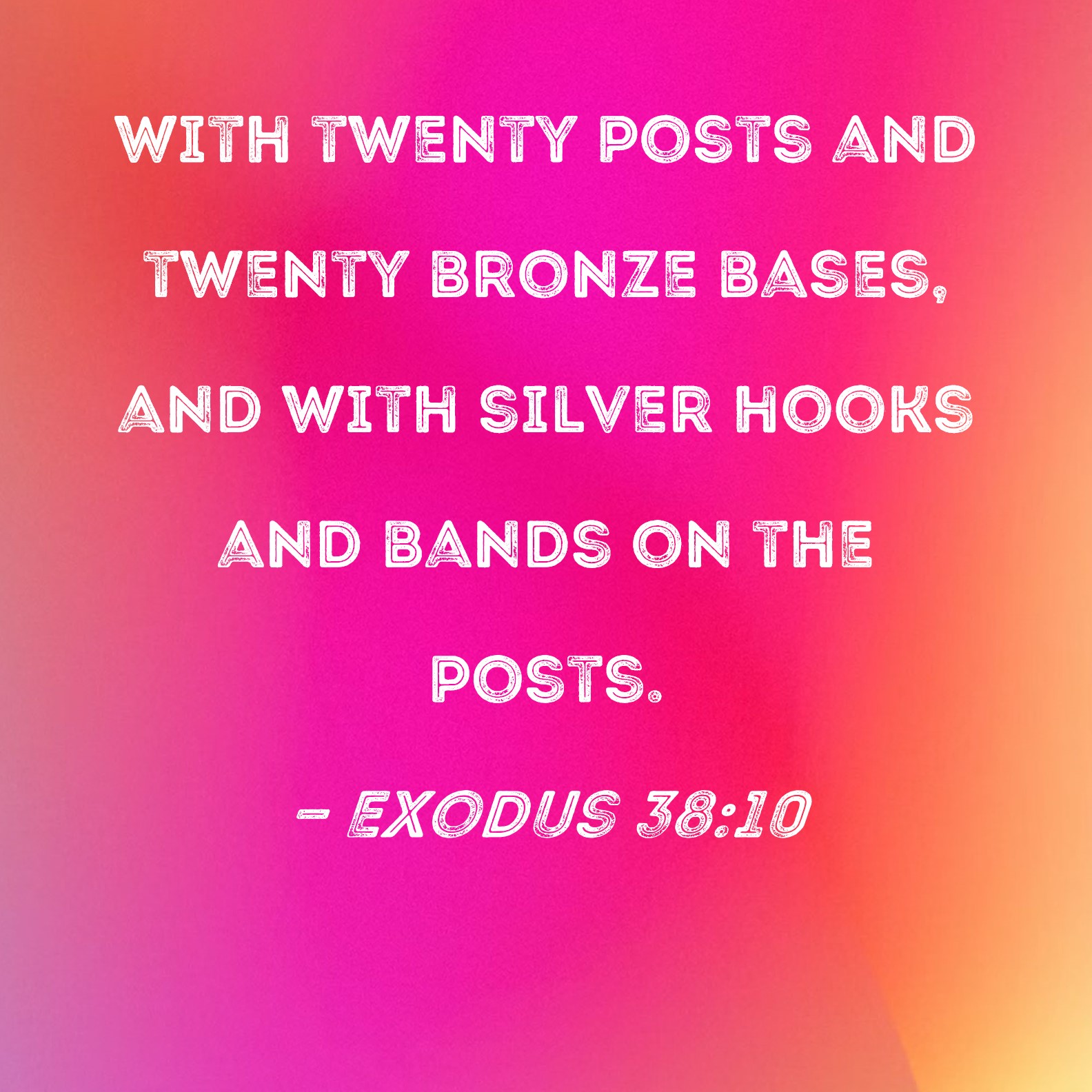 BSB: with twenty posts and twenty bronze bases, and with silver hooks and bands on the posts. KJV: Their pillars were twenty, and their brasen sockets twenty; the hooks of the pillars and their fillets were of silver. DRB: Twenty pillars of brass with their sockets, the heads of the pillars, and the whole graving of the work, of silver. DBT: their pillars twenty, and their bases twenty, of copper; the hooks of the pillars and their connecting-rods of silver. ERV: their pillars were twenty, and their sockets twenty, of brass; the hooks of the pillars and their fillets were of silver. WBT: Their pillars were twenty, and their brazen sockets twenty; the hooks of the pillars, and their fillets, were of silver. WEB: their pillars were twenty, and their sockets twenty, of bronze; the hooks of the pillars and their fillets were of silver. YLT: their pillars are twenty, and their brazen sockets twenty, the pegs of the pillars and their fillets are silver;Links Exodus 38:10 NIV • Exodus 38:10 NLT • Exodus 38:10 ESV • Exodus 38:10 NASB • Exodus 38:10 KJV • Exodus 38:10 Interlinear • Exodus 38:10 Commentaries • Exodus 38:10 Parallel Texts • Exodus 38:10 Bible Apps • Exodus 38:10 Parallel • Bible Hub |