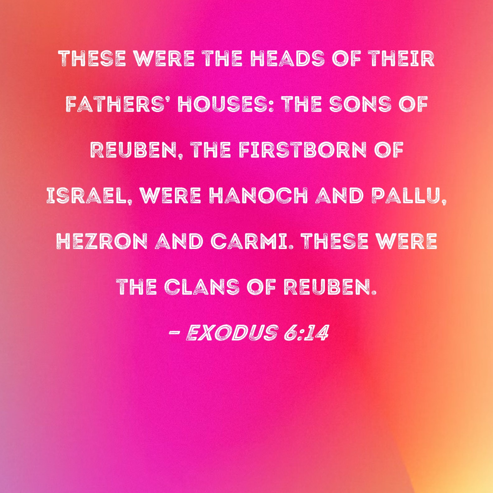 Exodus 6:14 These were the heads of their fathers' houses: The sons of Reuben, the firstborn of Israel, were Hanoch and Pallu, Hezron and Carmi. These were the clans of Reuben.