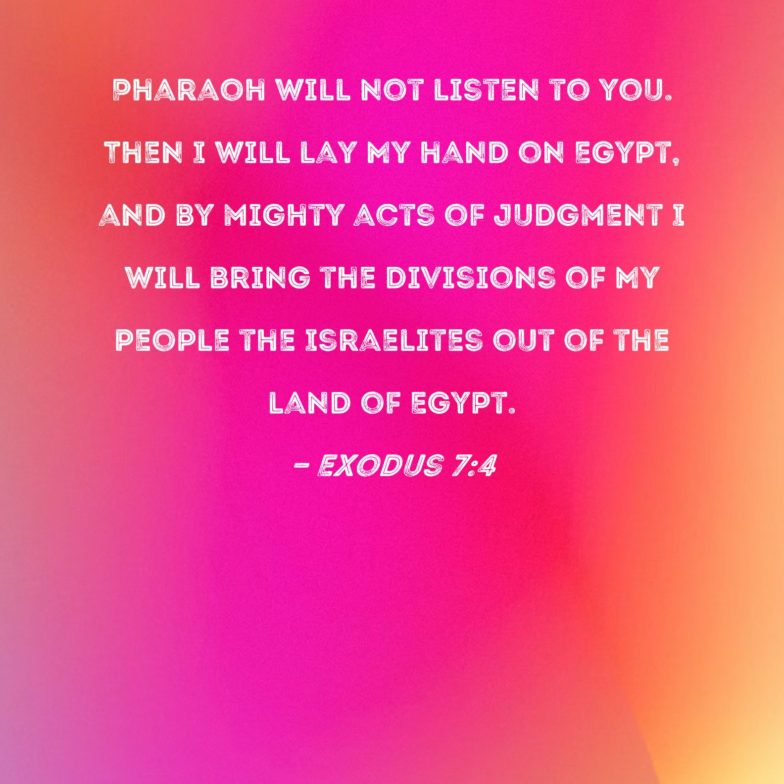 Exodus 7:4 Pharaoh will not listen to you. Then I will lay My hand on Egypt, and by mighty acts of judgment I will bring the divisions of My people the Israelites out of the land of Egypt.