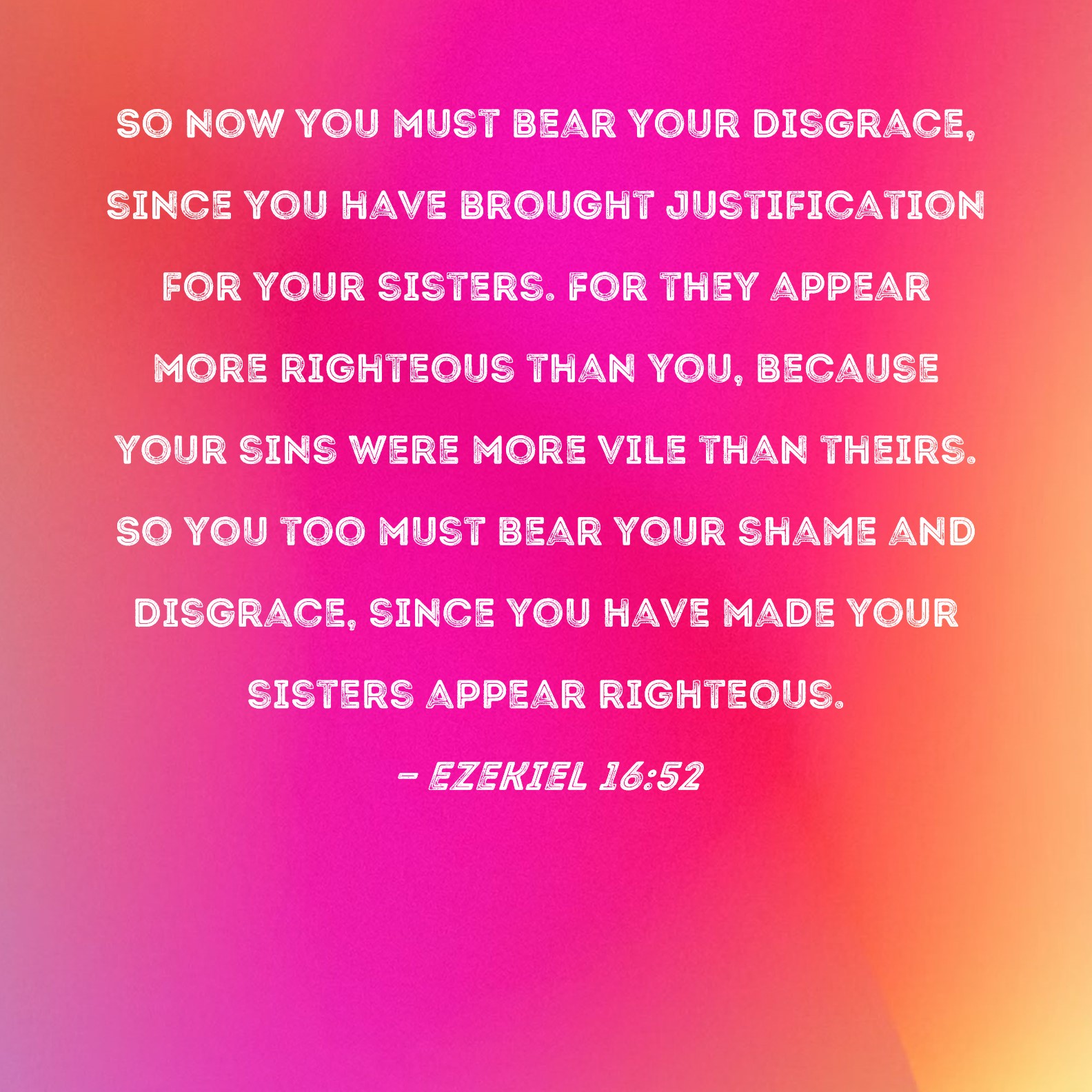 Ezekiel 16:52 So now you must bear your disgrace, since you have brought justification for your sisters. For they appear more righteous than you, because your sins were more vile than theirs. So you too must bear your shame and disgrace, since you have made your sisters appear righteous.