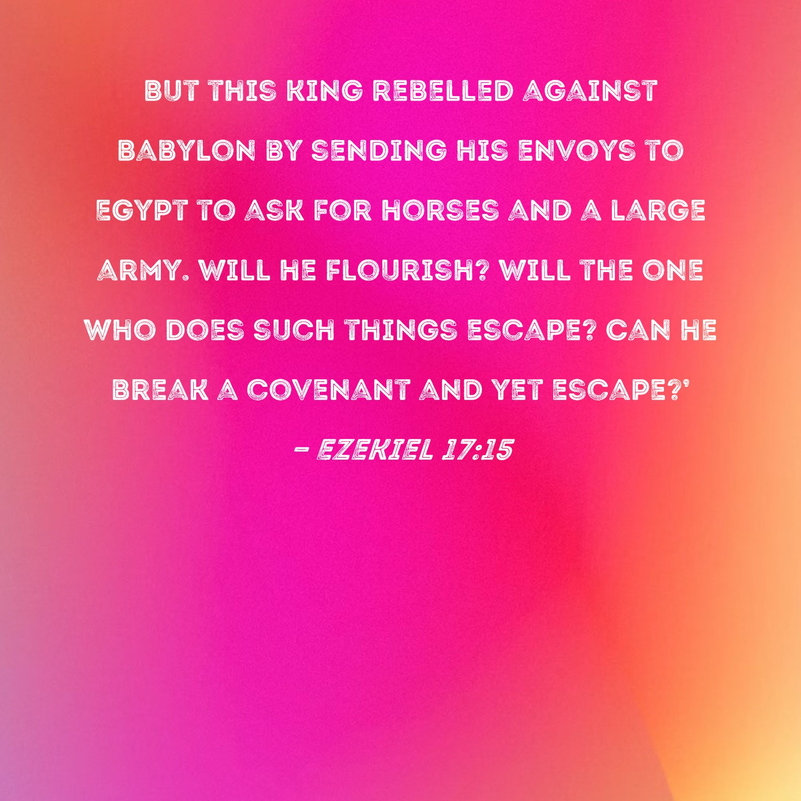 Ezekiel 17:15 But this king rebelled against Babylon by sending his envoys to Egypt to ask for horses and a large army. Will he flourish? Will the one who does such things escape? Can he break a covenant and yet escape?'