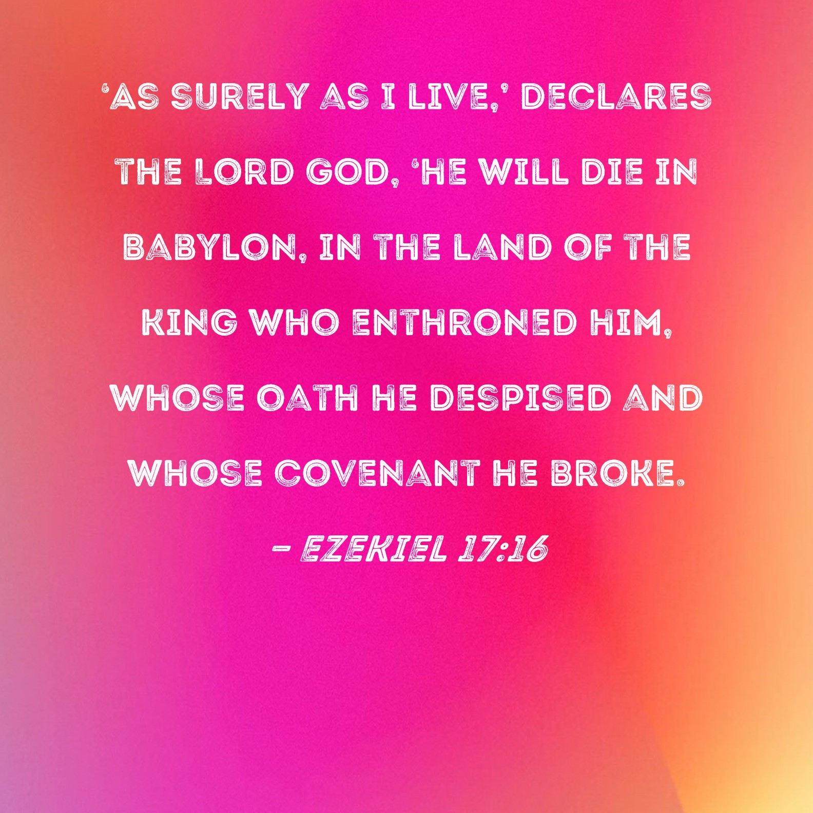 Ezekiel 17:16 As surely as I live,' declares the Lord GOD, 'he will die in Babylon, in the land of the king who enthroned him, whose oath he despised and whose covenant he broke.