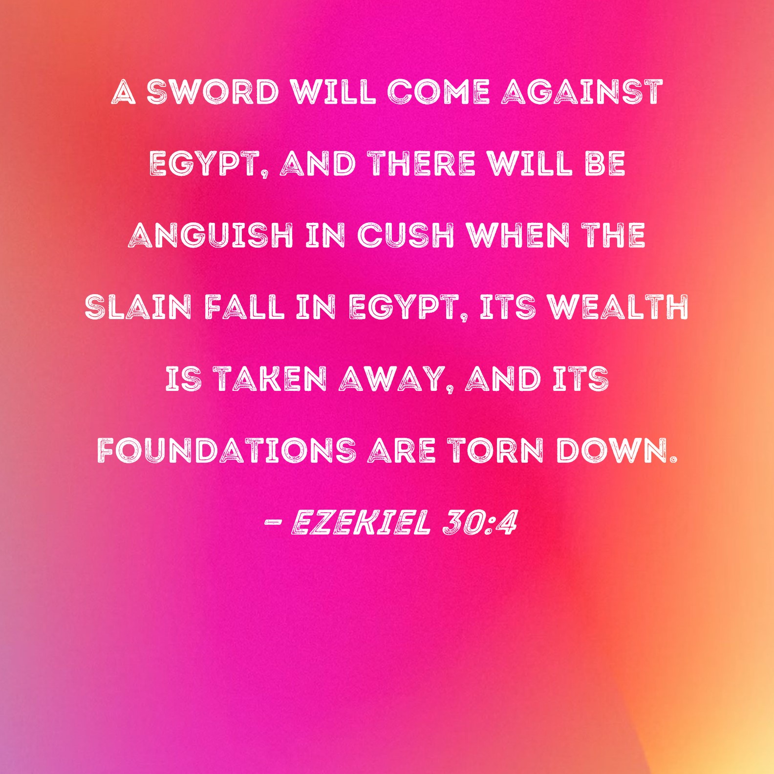 Ezekiel 30:4 A sword will come against Egypt, and there will be anguish in Cush when the slain fall in Egypt, its wealth is taken away, and its foundations are torn down.