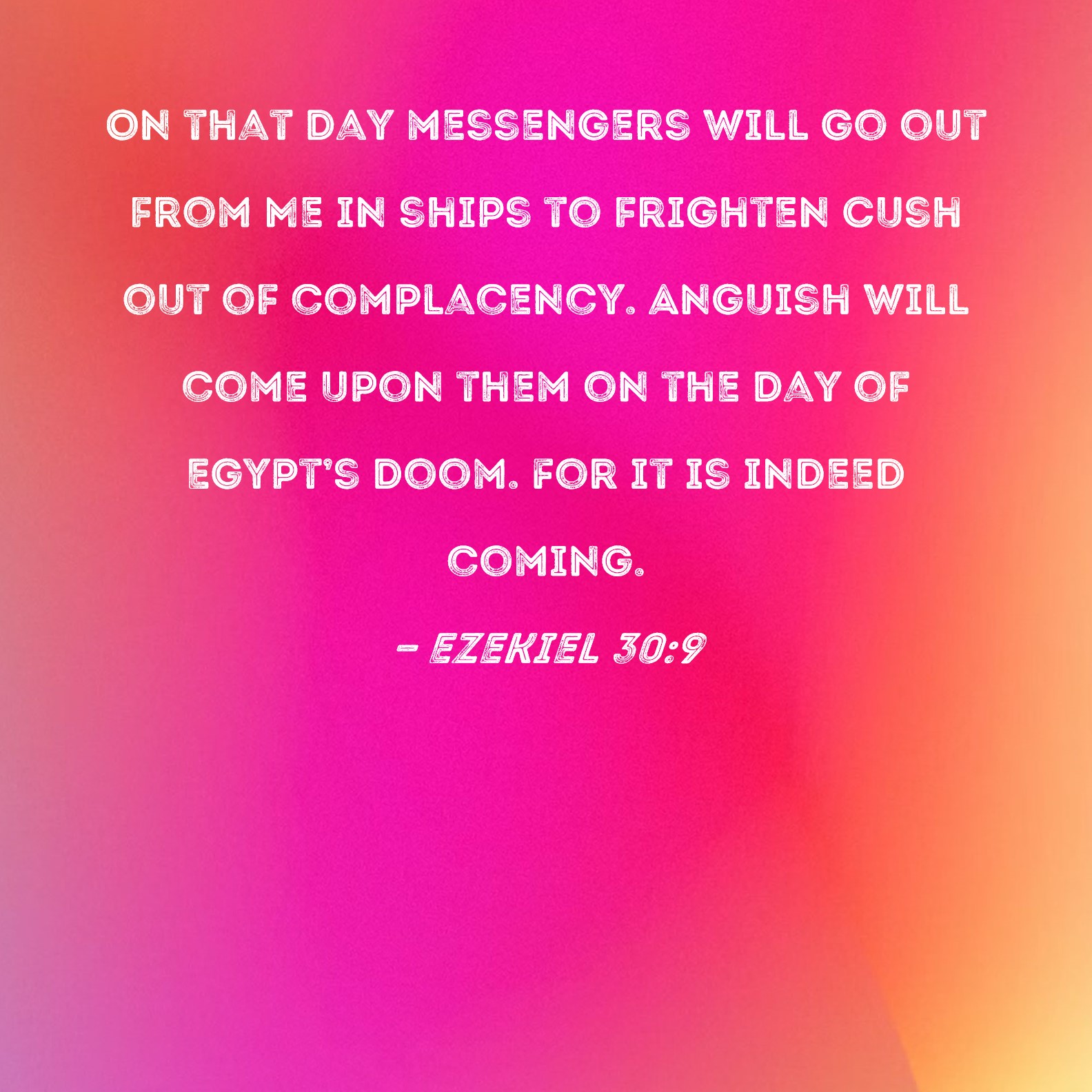 Ezekiel 30:9 On that day messengers will go out from Me in ships to frighten Cush out of complacency. Anguish will come upon them on the day of Egypt's doom. For it is indeed coming.
