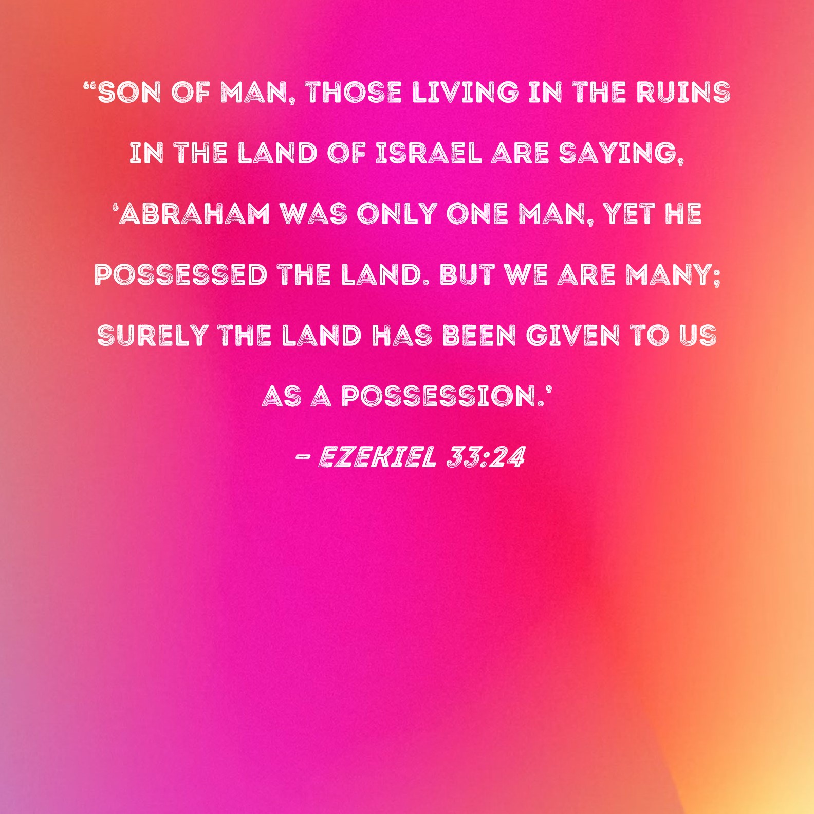 Ezekiel 33:24 "Son of man, those living in the ruins in the land of Israel are saying, 'Abraham was only one man, yet he possessed the land. But we are many; surely the land has been given to us as a possession.'