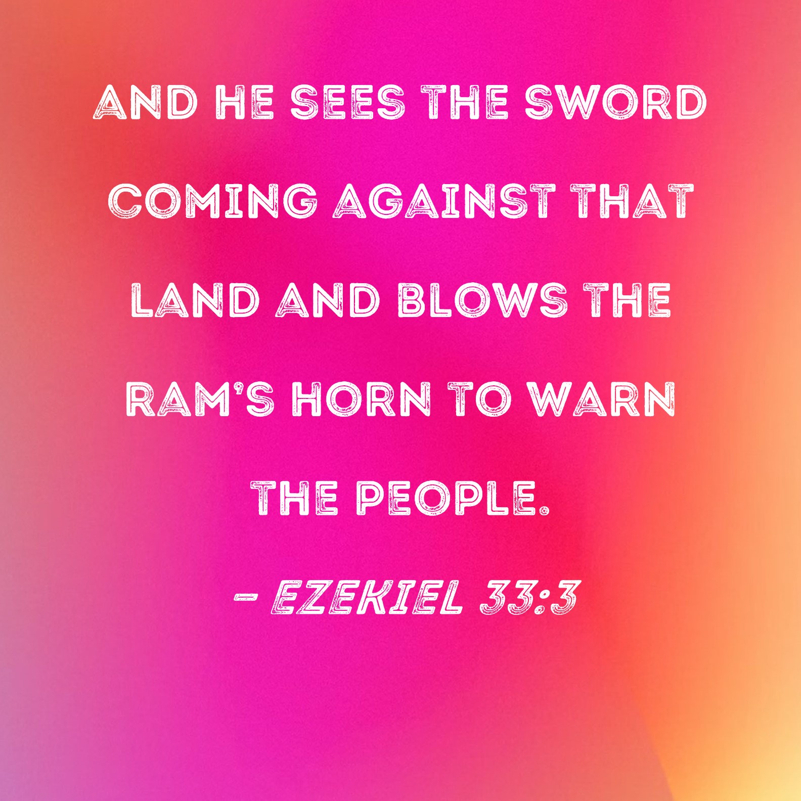 Ezekiel 33:3 and he sees the sword coming against that land and blows the ram's horn to warn the people.