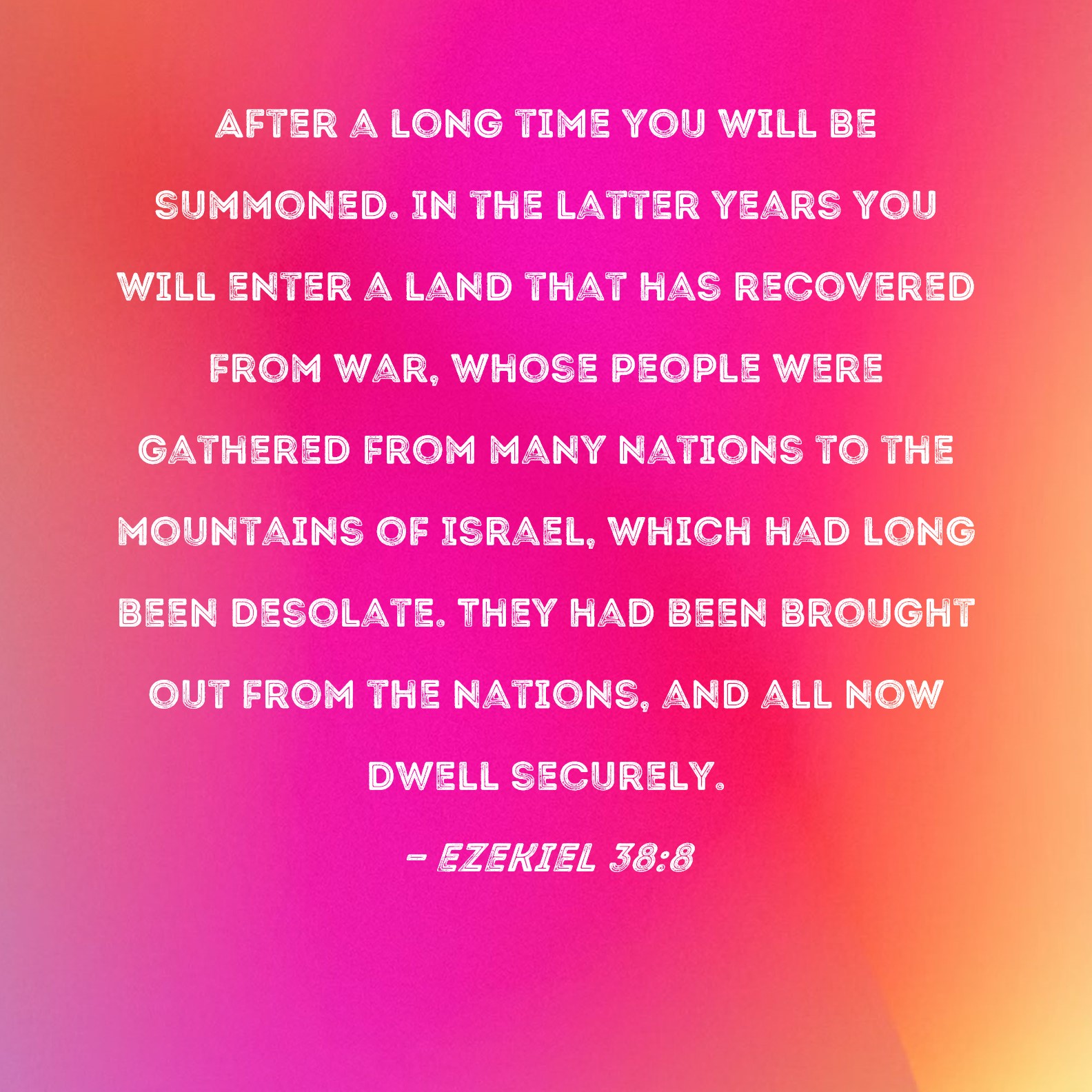 Ezekiel 38:8 After a long time you will be summoned. In the latter years you will enter a land that has recovered from war, whose people were gathered from many nations to the mountains of Israel, which had long been desolate. They had been brought out from the nations, and all now dwell securely.