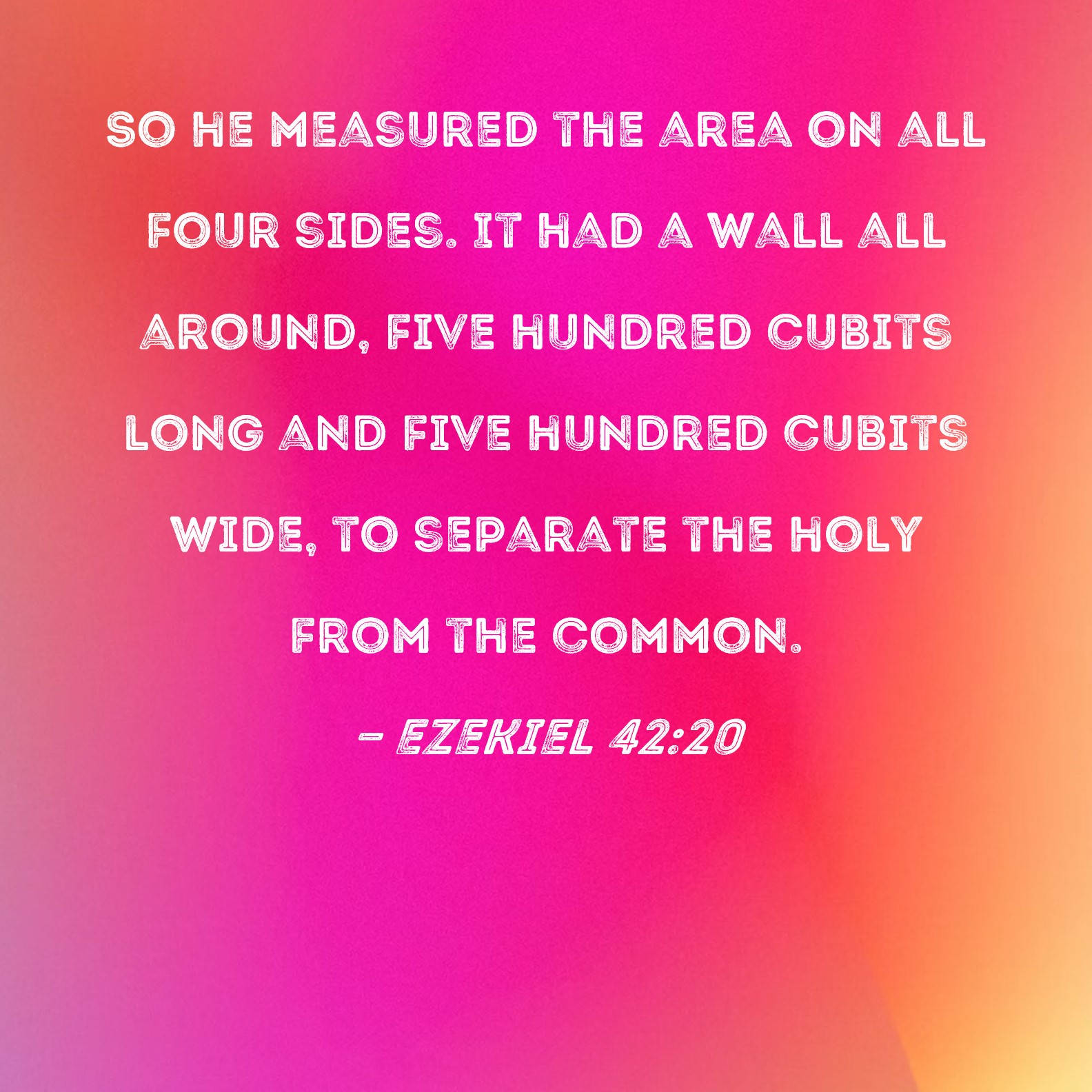 Ezekiel 42:20 So he measured the area on all four sides. It had a wall all around, five hundred cubits long and five hundred cubits wide, to separate the holy from the common.
