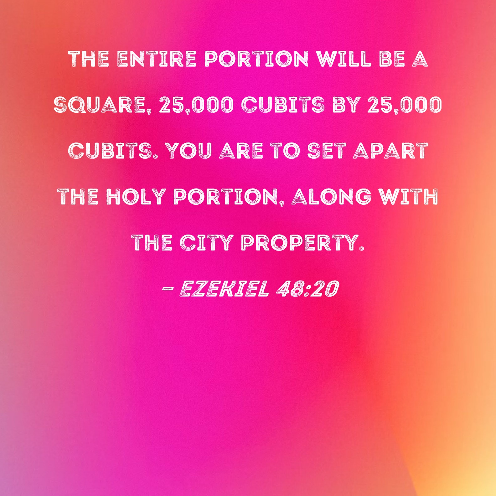 Ezekiel 48:20 The entire portion will be a square, 25,000 cubits by 25,000 cubits. You are to set apart the holy portion, along with the city property.