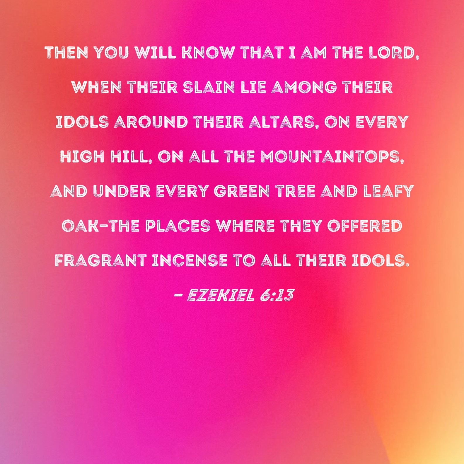 Ezekiel 6:13 Then you will know that I am the LORD, when their slain lie among their idols around their altars, on every high hill, on all the mountaintops, and under every green tree and leafy oak--the places where they offered fragrant incense to all their idols.