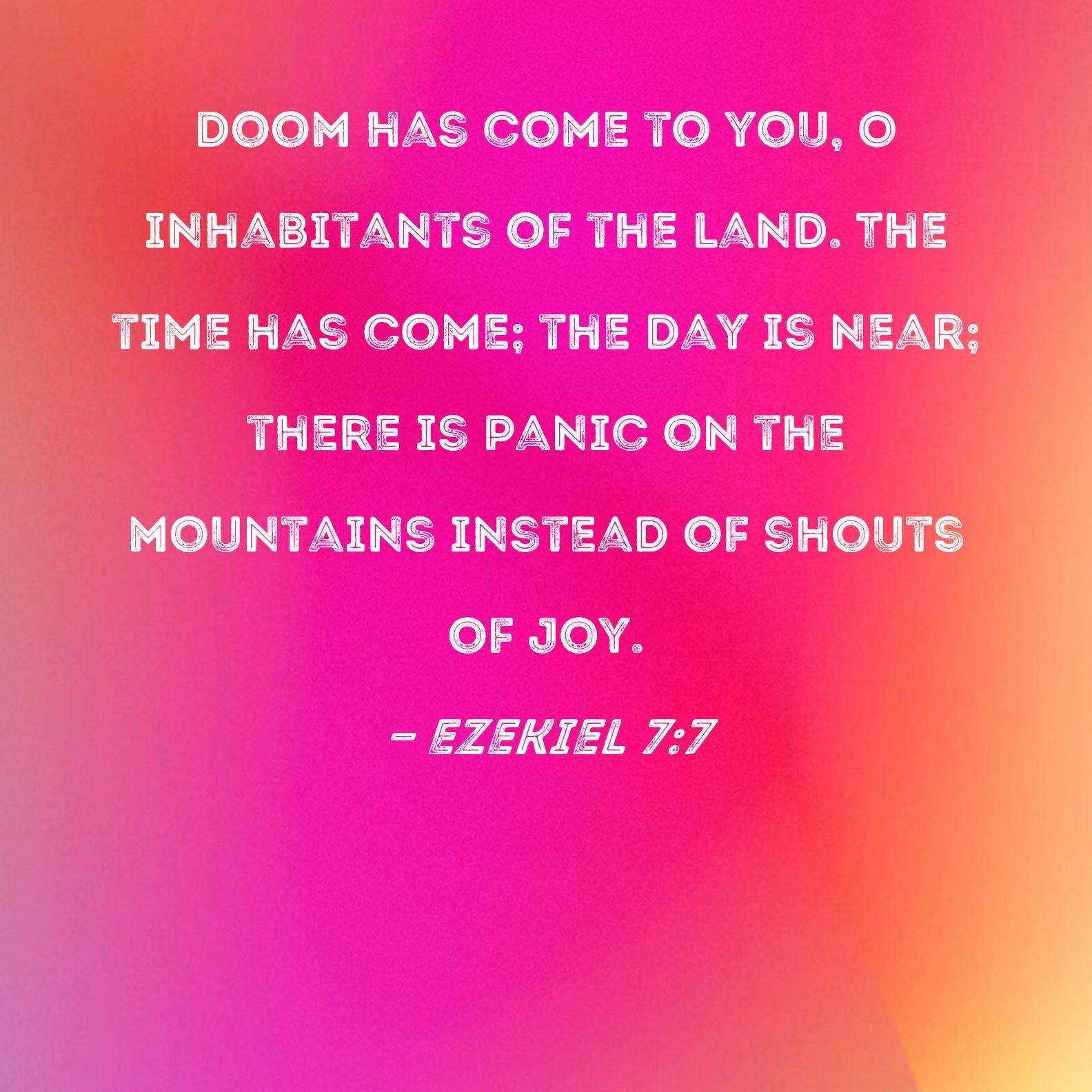 Ezekiel 7:7 Doom has come to you, O inhabitants of the land. The time has come; the day is near; there is panic on the mountains instead of shouts of joy.