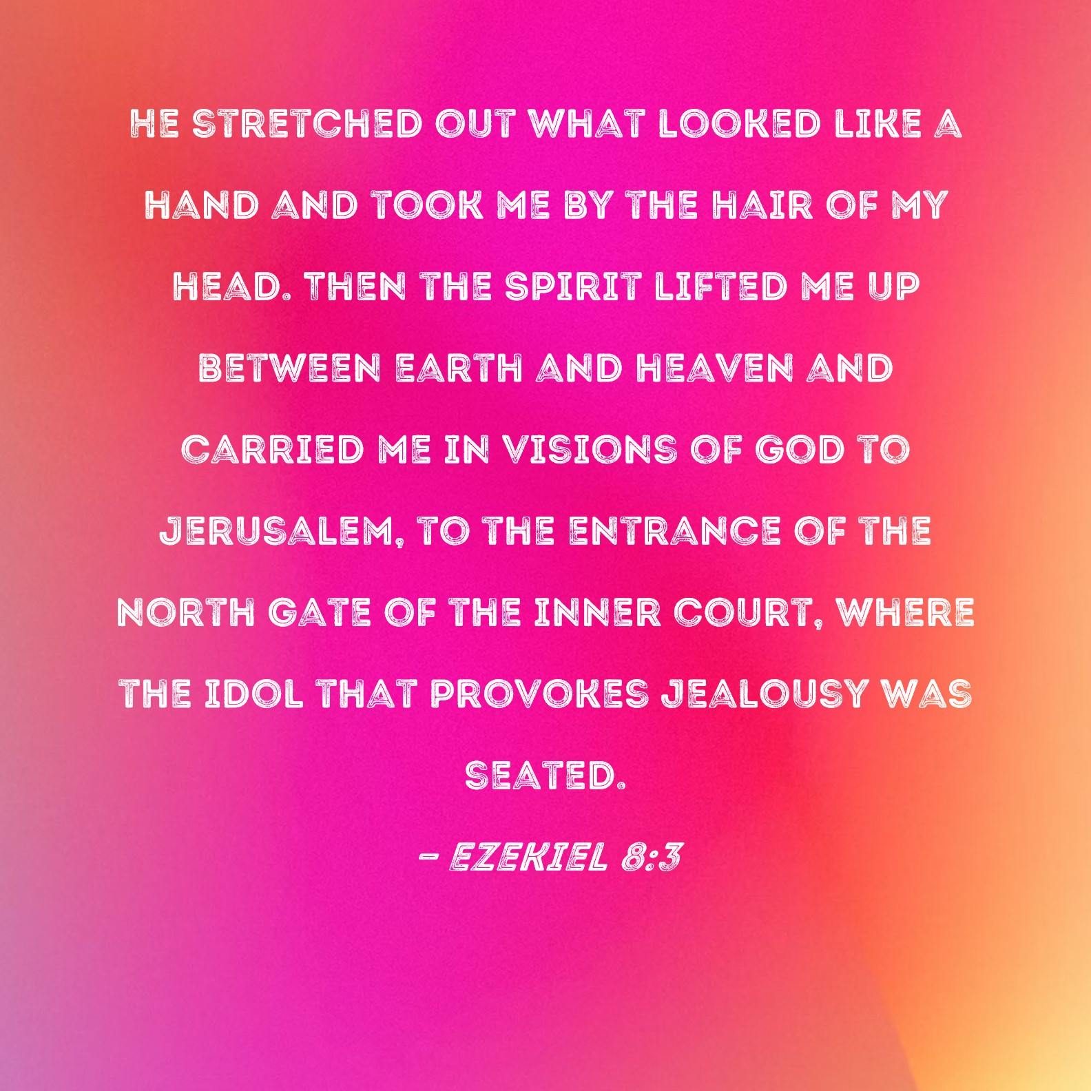 He stretched out what looked like a hand and took me by the hair of my head. Then the Spirit lifted me up between earth and heaven and carried me in visions of God to Jerusalem, to the entrance of the north gate of the inner court, where the idol that provokes jealousy was seated.