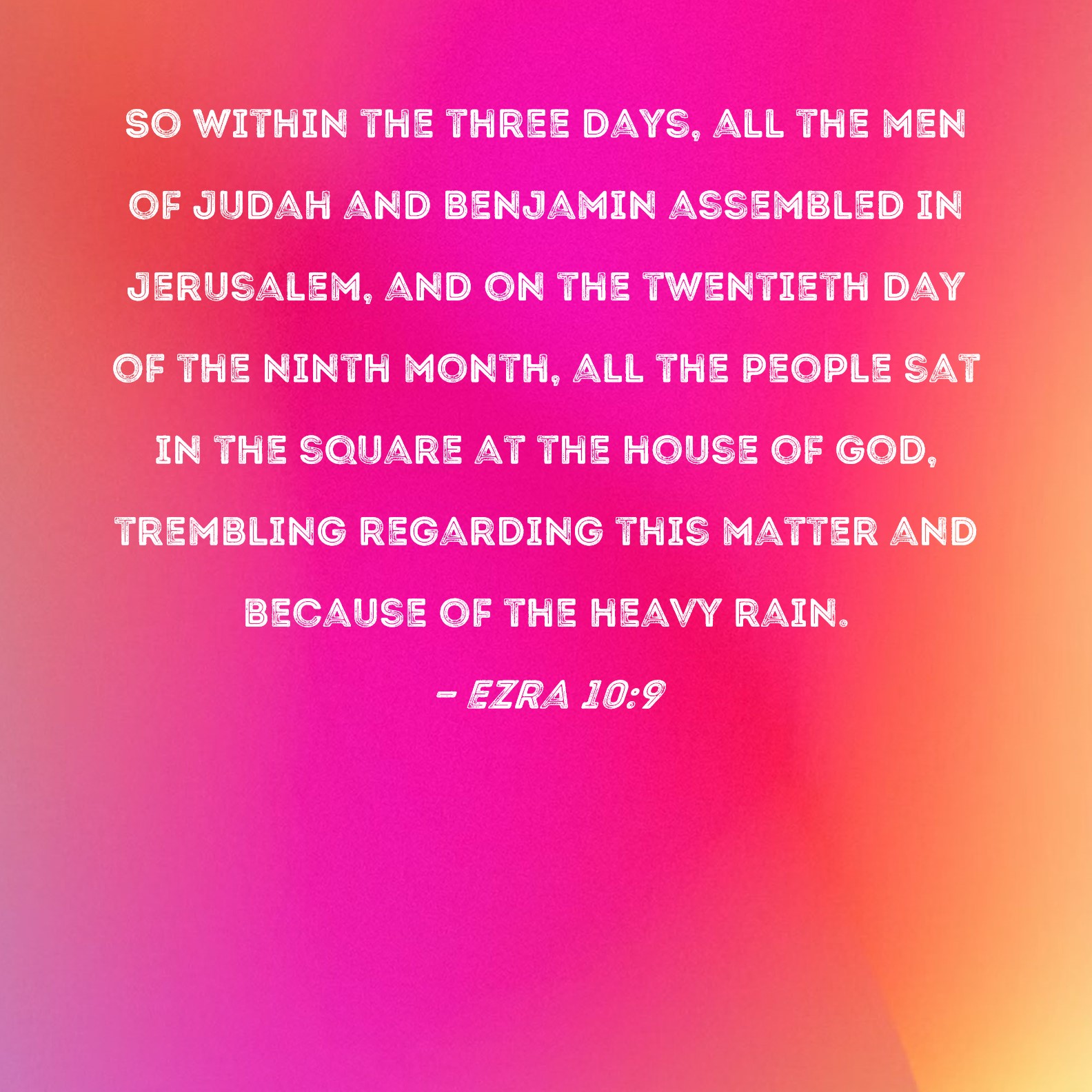Ezra 10:9 So within the three days, all the men of Judah and Benjamin assembled in Jerusalem, and on the twentieth day of the ninth month, all the people sat in the square at the house of God, trembling regarding this matter and because of the heavy rain.