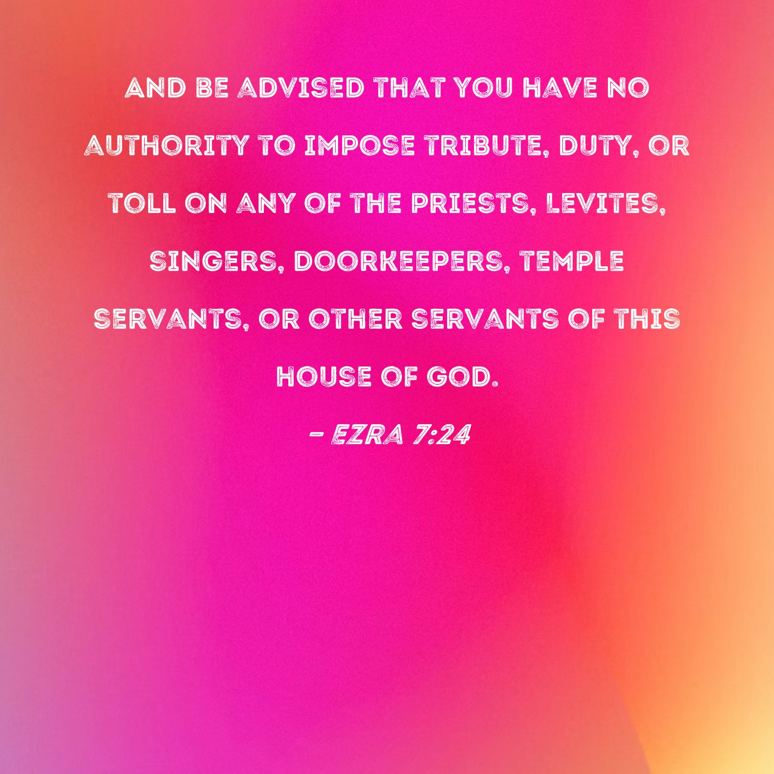 BSB: And be advised that you have no authority to impose tribute, duty, or toll on any of the priests, Levites, singers, doorkeepers, temple servants, or other servants of this house of God. KJV: Also we certify you, that touching any of the priests and Levites, singers, porters, Nethinims, or ministers of this house of God, it shall not be lawful to impose toll, tribute, or custom, upon them. DRB: We give you also to understand concerning all the priests, and the Levites, and the singers, and the porters, and the Nathinites, and ministers of the house of this God, that you have no authority to impose toll or tribute, or custom upon them. DBT: Also we inform you, as regards all the priests and Levites, singers, doorkeepers, Nethinim, and ministers of this house of God, it shall not be lawful to impose tribute, tax, and toll upon them. ERV: Also we certify you, that touching any of the priests and Levites, the singers, porters, Nethinim, or servants of this house of God, it shall not be lawful to impose tribute, custom, or toll, upon them. WBT: Also we certify you, that concerning any of the priests and Levites, singers, porters, Nethinims, or ministers of this house of God, it shall not be lawful to impose toll, tribute, or custom upon them. WEB: Also we inform you that it shall not be lawful to impose tribute, custom, or toll on any of the priests, Levites, singers, gatekeepers, temple servants, or laborers of this house of God. YLT: 'And to you we are making known, that upon any of the priests and Levites, singers, gatekeepers, Nethinim, and servants of the house of God, tribute and custom there is no authority to lift up.Links Ezra 7:24 NIV • Ezra 7:24 NLT • Ezra 7:24 ESV • Ezra 7:24 NASB • Ezra 7:24 KJV • Ezra 7:24 Interlinear • Ezra 7:24 Commentaries • Ezra 7:24 Parallel Texts • Ezra 7:24 Bible Apps • Ezra 7:24 Parallel • Bible Hub |