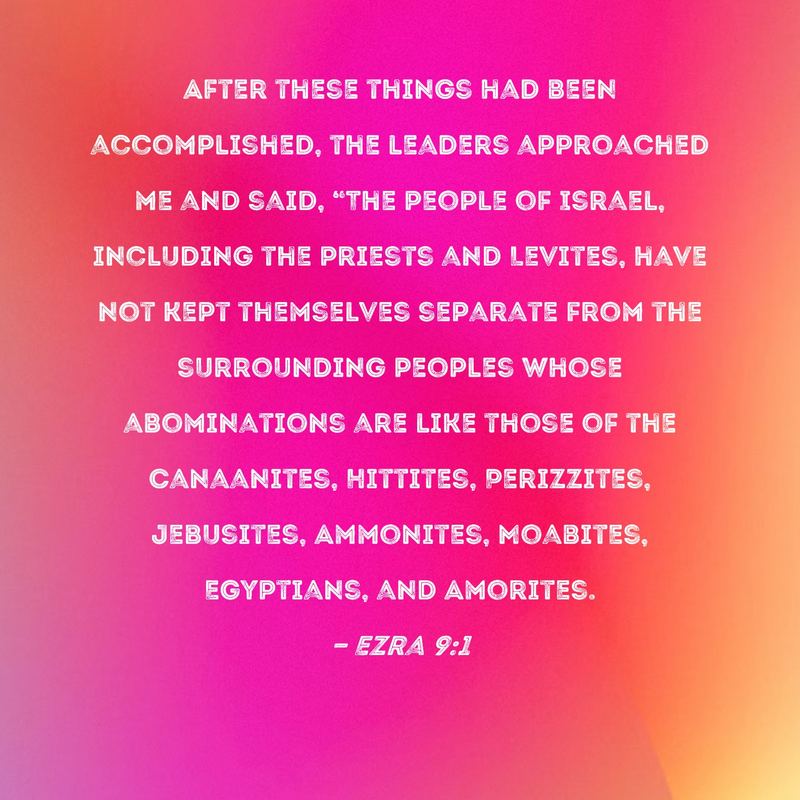 KJV:  Now when these things were done, the princes came to me, saying, The people of Israel, and the priests, and the Levites, have not separated themselves from the people of the lands, doing according to their abominations, even of the Canaanites, the Hittites, the Perizzites, the Jebusites, the Ammonites, the Moabites, the Egyptians, and the Amorites.