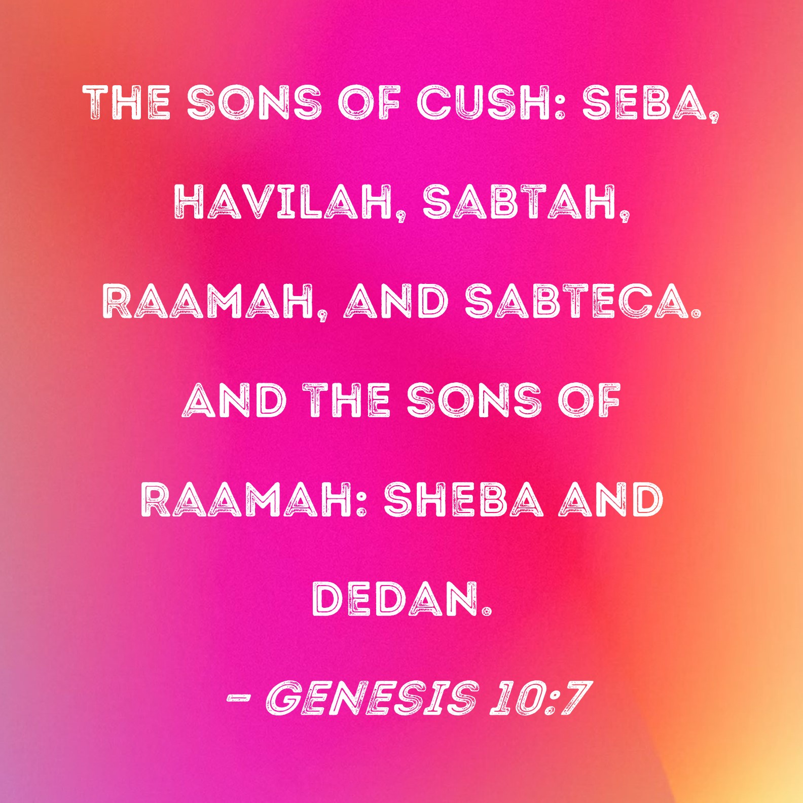 Genesis 10:7 The sons of Cush: Seba, Havilah, Sabtah, Raamah, and Sabteca. And the sons of Raamah: Sheba and Dedan.