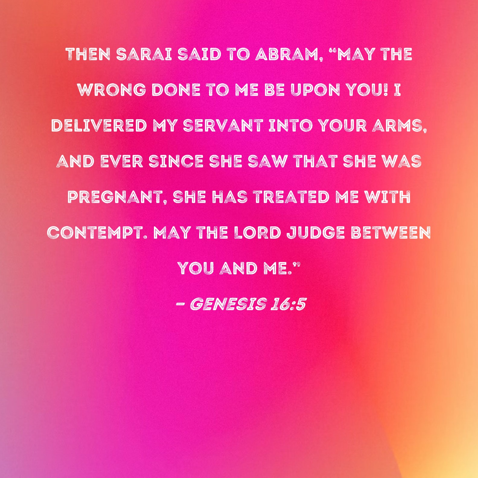 Genesis 16:5 Then Sarai said to Abram, "May the wrong done to me be upon you! I delivered my servant into your arms, and ever since she saw that she was pregnant, she has treated me with contempt. May the LORD judge between you and me."